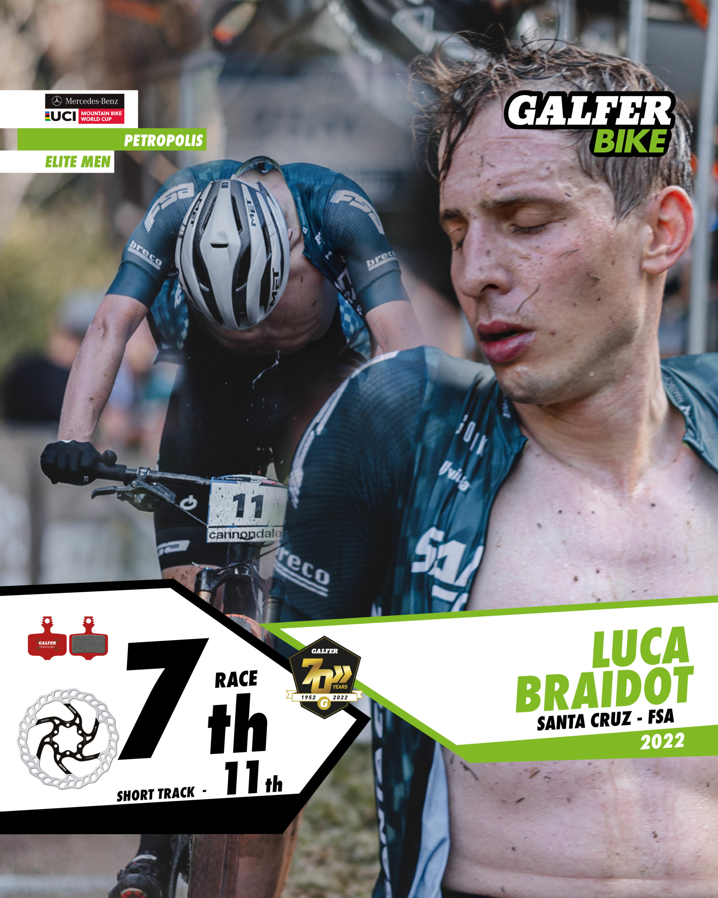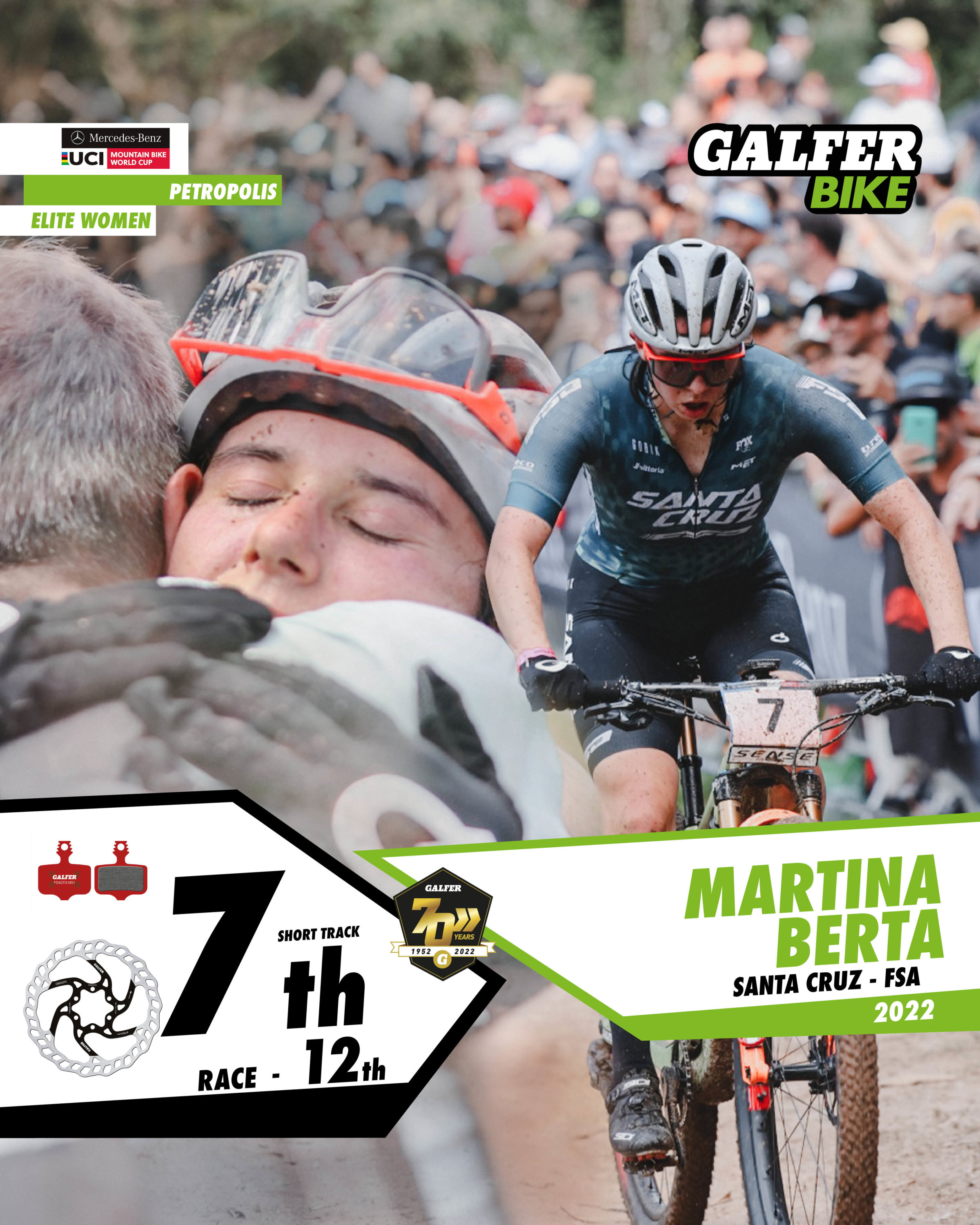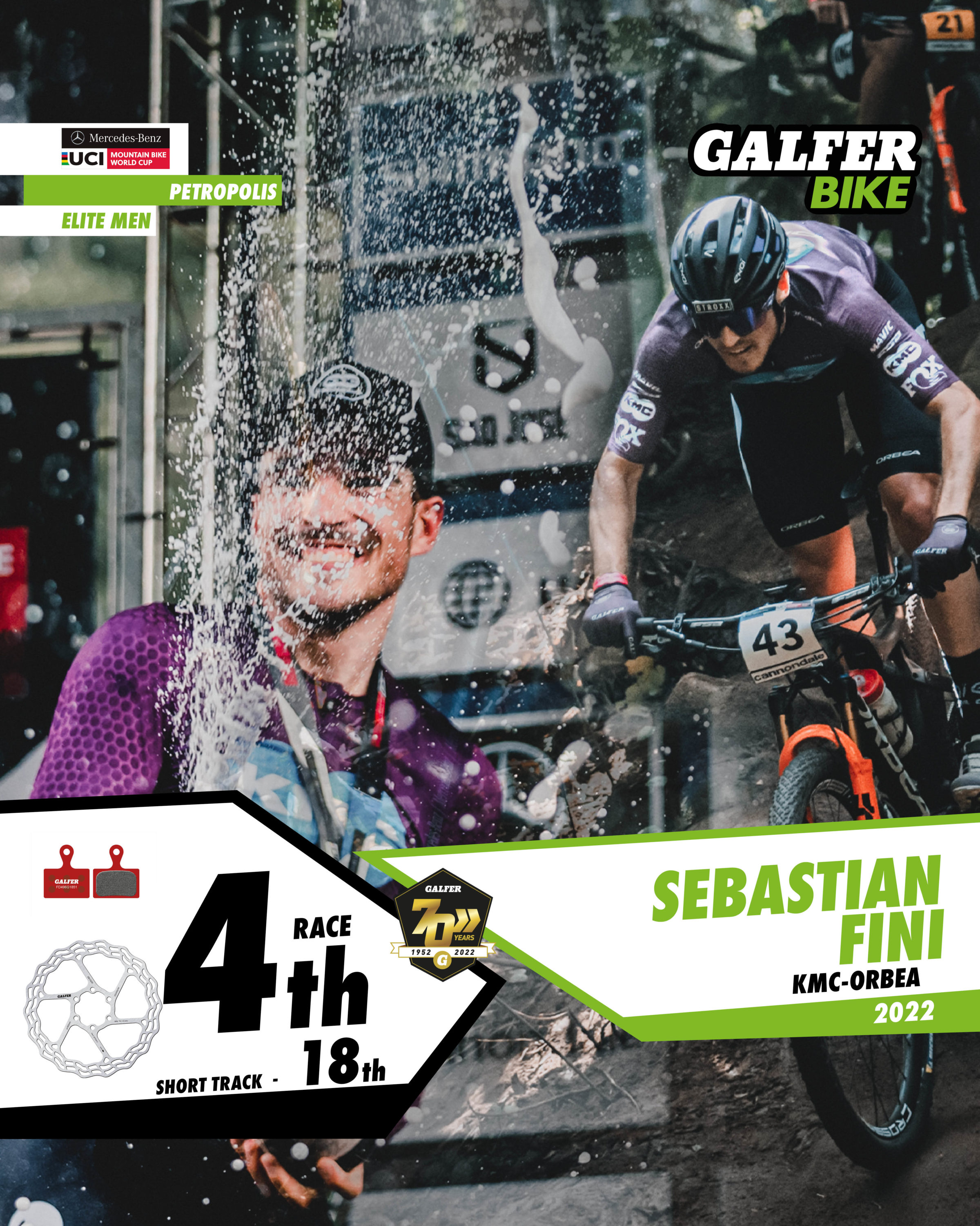 In the Elite Men’s category, four Galfer Bike representatives finished in the top ten, with Frenchman Maxime Marotte (Santa Cruz-FSA) in second place. Marotte rode in the main group throughout the race, and on the last lap he launched an attack that left him with a chance of victory, but his rival, Nino Schurter, beat him in the final sprint by just a few tenths of a second. Two riders from the KMC-Orbea team, Danish rider Sebastian Fini Carstensen and Belgian Pierre de Froidmont, took 4th and 6th positions after a great team comeback. And to round off the impressive performance of the Galfer Bike riders, Italian Luca Braidot (Santa Cruz-FSA) finished in 7th position. All of them use 160 mm “Disc Wave®” brake discs, as well as Galfer Bike brake pads in Advanced G1851 compound.