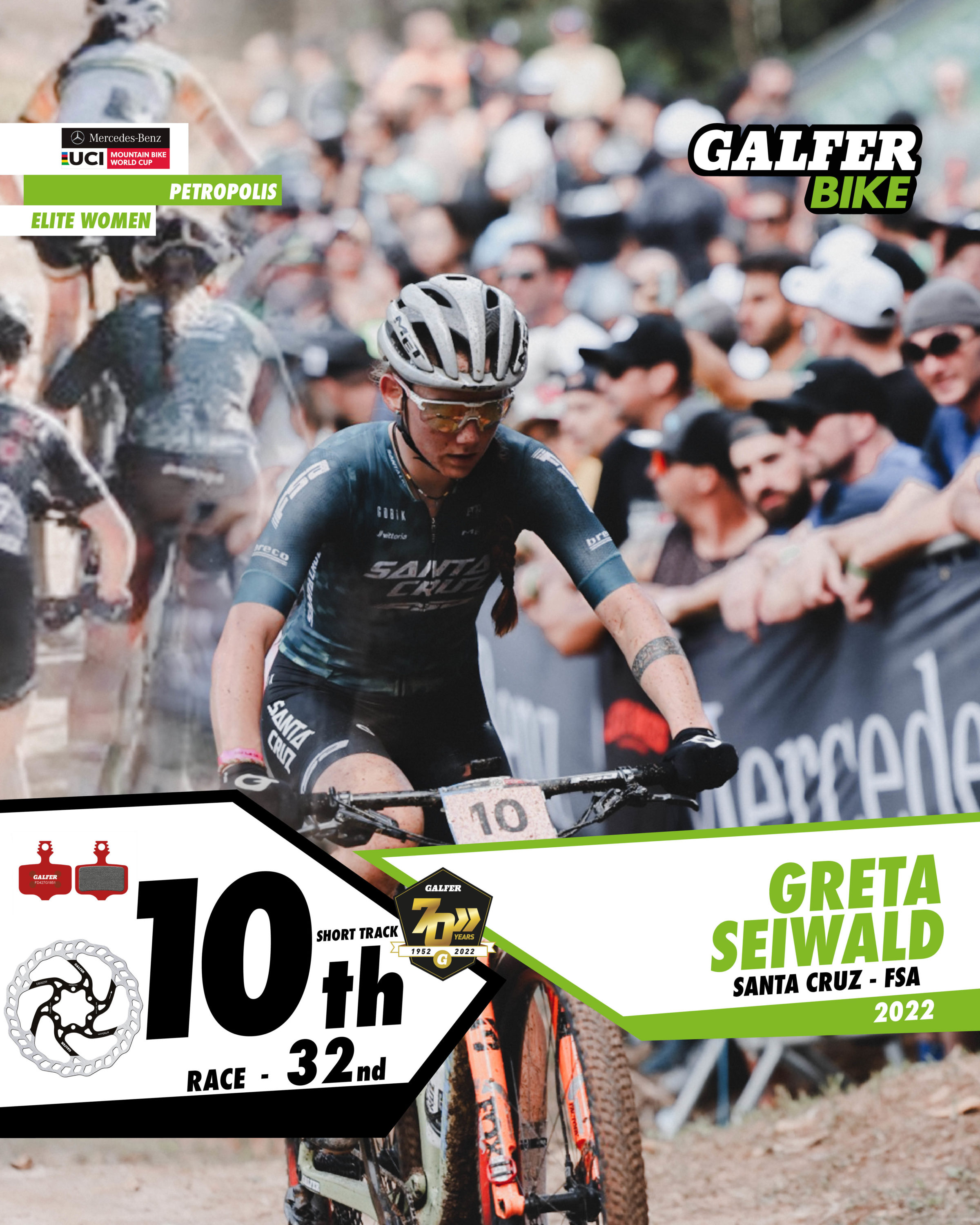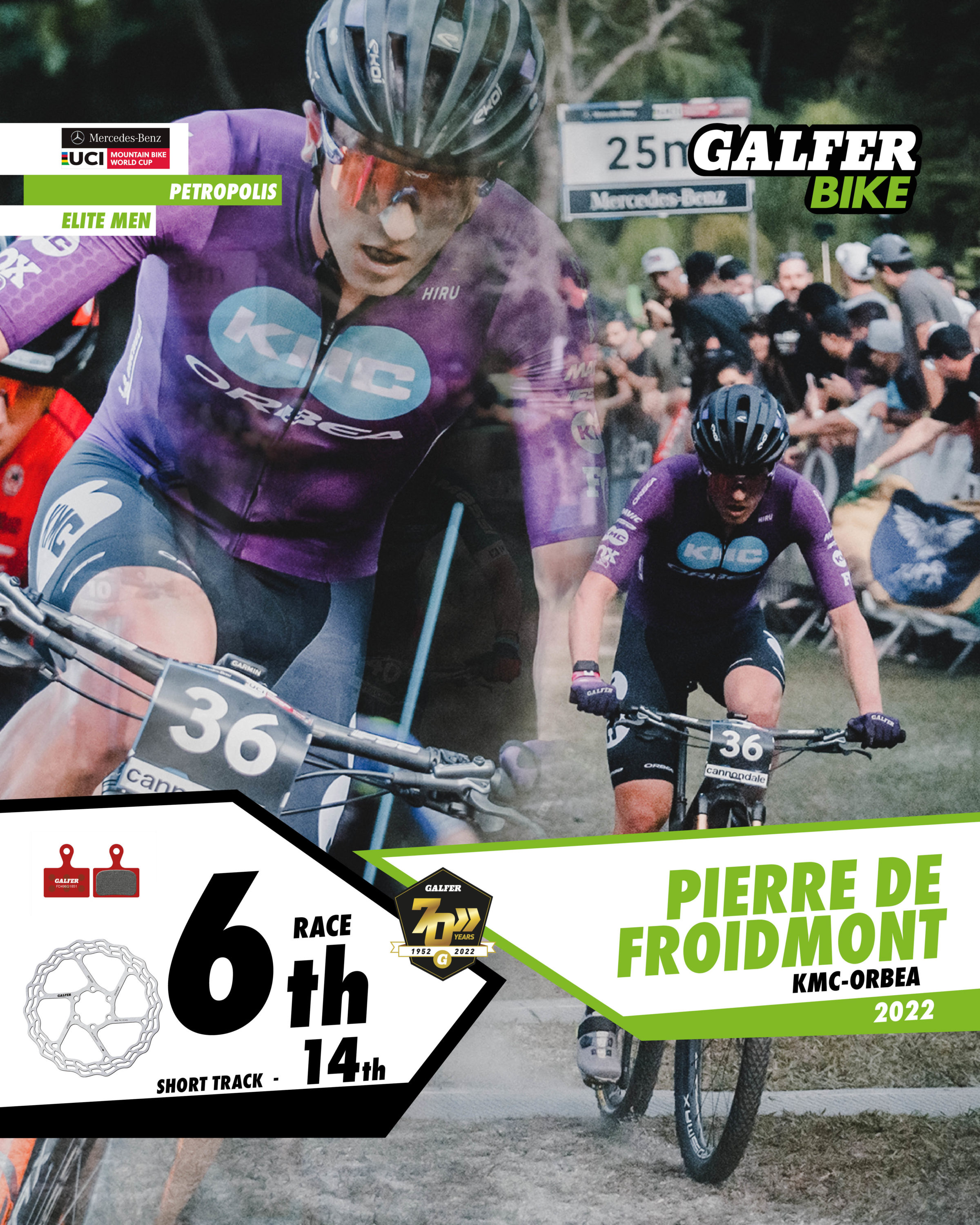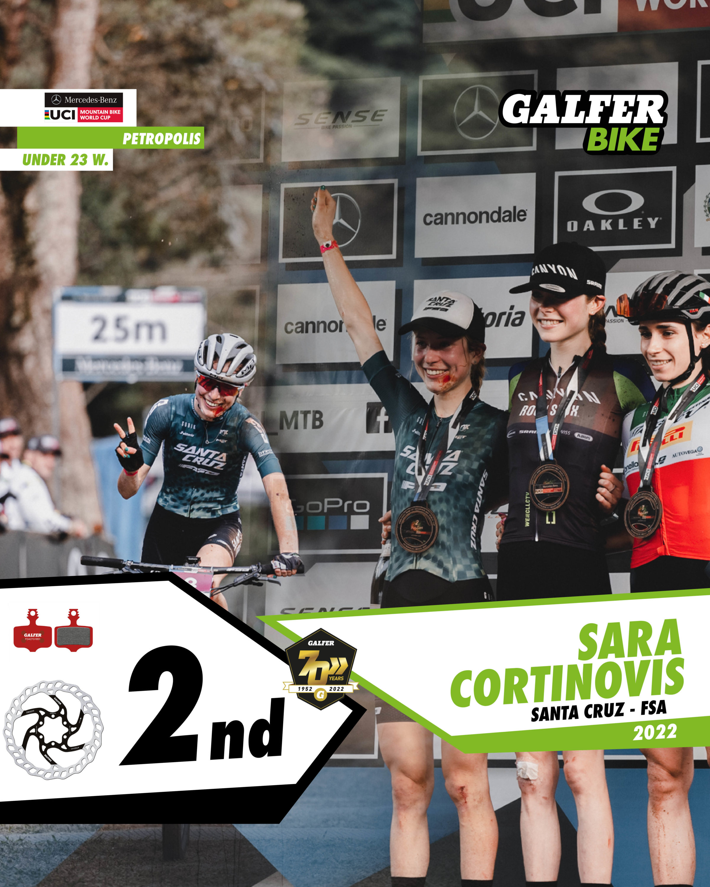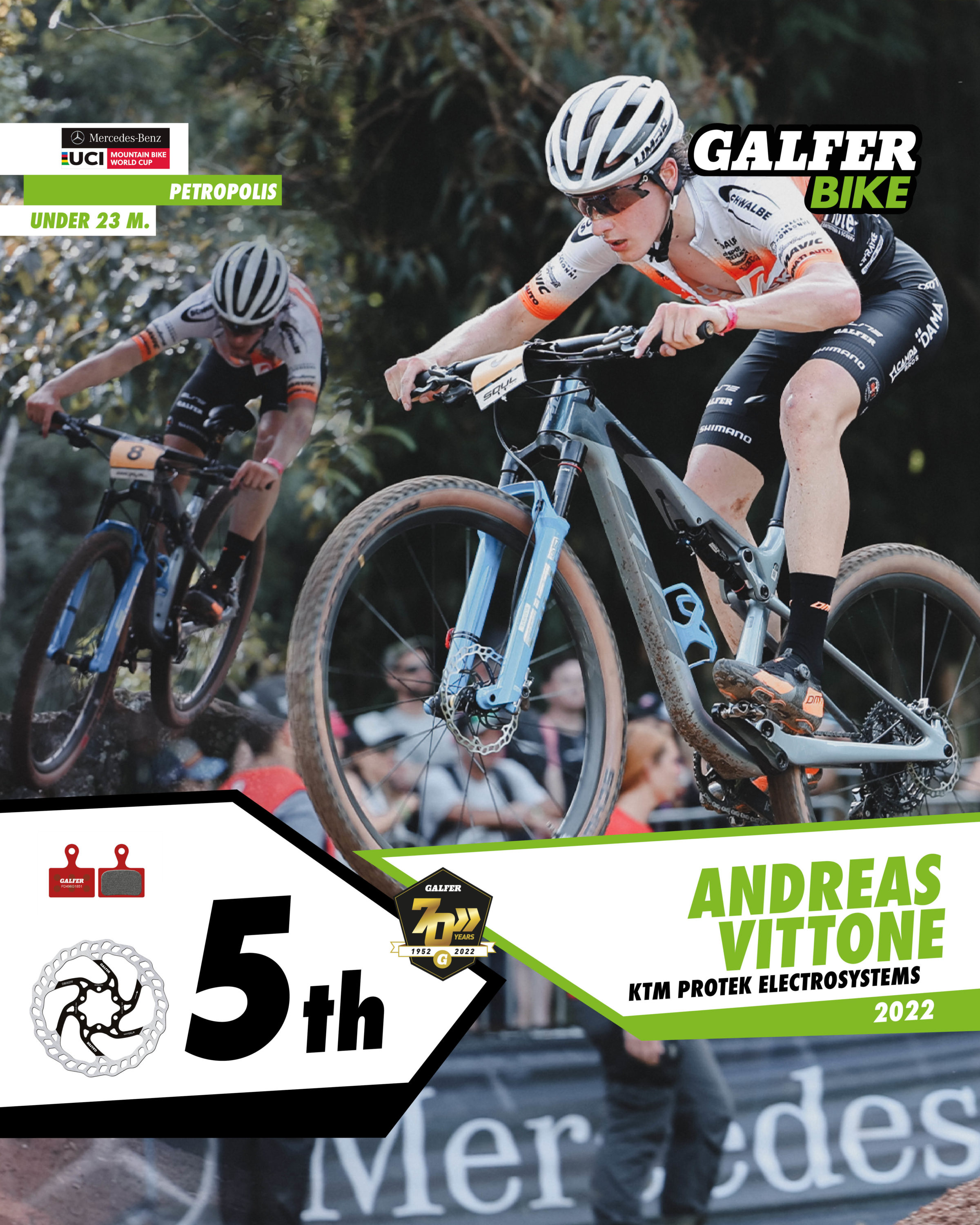 In the Elite Men’s category, four Galfer Bike representatives finished in the top ten, with Frenchman Maxime Marotte (Santa Cruz-FSA) in second place. Marotte rode in the main group throughout the race, and on the last lap he launched an attack that left him with a chance of victory, but his rival, Nino Schurter, beat him in the final sprint by just a few tenths of a second. Two riders from the KMC-Orbea team, Danish rider Sebastian Fini Carstensen and Belgian Pierre de Froidmont, took 4th and 6th positions after a great team comeback. And to round off the impressive performance of the Galfer Bike riders, Italian Luca Braidot (Santa Cruz-FSA) finished in 7th position. All of them use 160 mm “Disc Wave®” brake discs, as well as Galfer Bike brake pads in Advanced G1851 compound.