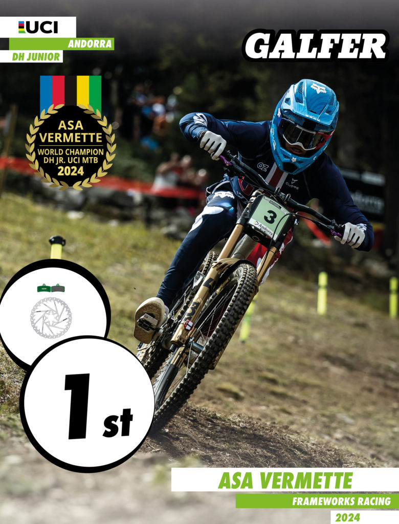 La giovane promessa di 17 anni ha offerto una prestazione eccezionale, conquistando la medaglia d’oro e l’ambita maglia arcobaleno, che lo distingue come il miglior pilota di DH Junior del mondo per il prossimo anno. Vermette ha registrato un tempo vincente di 2:39.185, finendo 1,5 secondi davanti al suo concorrente più vicino e ottenendo il quarto miglior tempo dell’intero evento, compresi i piloti Elite. Asa Vermette e il team Frameworks Racing equipaggiano le loro biciclette con i componenti frenanti ad alte prestazioni di Galfer, in particolare i dischi “Disc Wave®” e “Disc Shark®” rispettivamente all’anteriore e al posteriore, insieme alle pastiglie dei freni Pro G1554T. Questi componenti sono riconosciuti per la loro potente e precisa capacità di frenata, senza bisogno di periodo di rodaggio. Anche il pilota francese Mylann Falquet, rappresentante di Galfer, ha ottenuto un meritevole 5º posto nella finale di DH Junior.