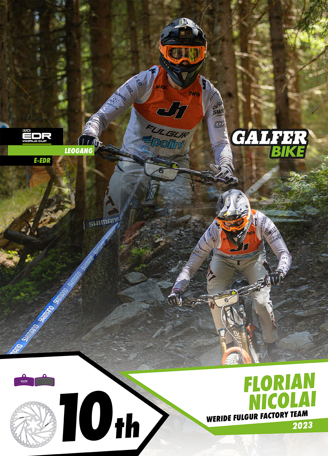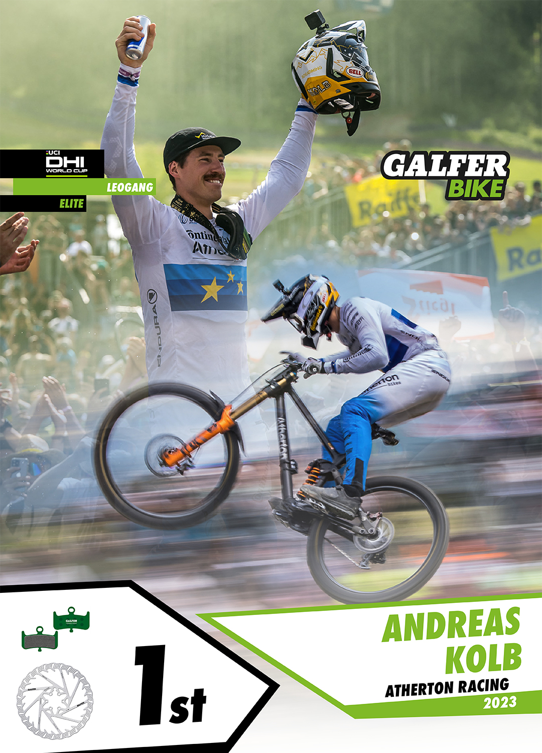 Nella specialità della Discesa, l’atleta locale Andreas Kolb (Continental Atherton) ha conseguito una vittoria incredibile, facendo segnare il miglior tempo davanti a tutti i favoriti della categoria. Kolb è stato l’unico partecipante a scendere sotto i 3 minuti (02:59:335) durante tutto il weekend, e lo ha fatto nella manche finale, ottenendo così la sua prima e meritata vittoria nella Coppa del Mondo UCI DH Elite dopo 9 anni come professionista. Andreas Kolb utilizza i dischi freno “Disc Shark®”, insieme alle pastiglie freno Galfer Pro G1554T, per competere con la sua bicicletta Atherton. In questo modo, Kolb si posiziona al quarto posto nella classifica generale con 476 punti dopo due gare.