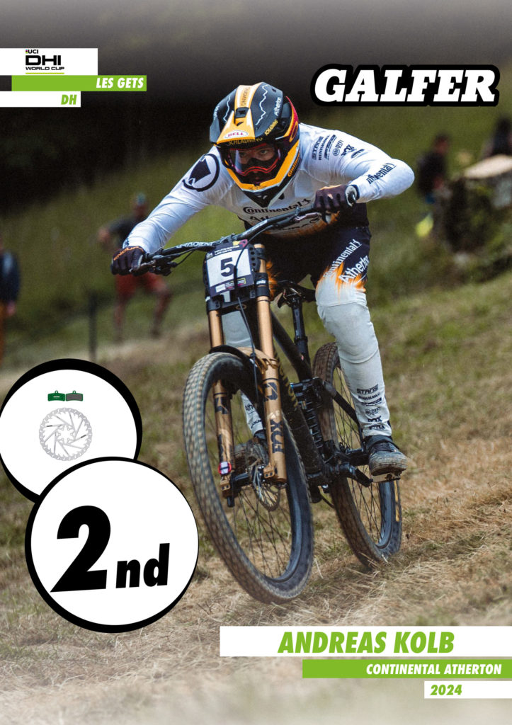 Nella categoria Elite maschile, il fine settimana è stato caratterizzato da un drastico cambiamento delle condizioni. Mentre le qualificazioni di sabato si sono svolte sotto un clima soleggiato, la finale di domenica si è disputata sotto una pioggia intensa, trasformando il terreno in una sfida fangosa e scivolosa. In queste difficili condizioni, Andreas Kolb e la sua Atherton A200, equipaggiata con gli eccezionali Disc Shark® e pastiglie freno Galfer, hanno dimostrato che la vera qualità risplende nell’avversità. Kolb, con abilità e precisione sorprendenti, ha ottenuto un impressionante secondo posto, riaffermando il suo status tra i migliori del mondo e salendo nuovamente sul podio della Coppa del Mondo UCI DH Elite.