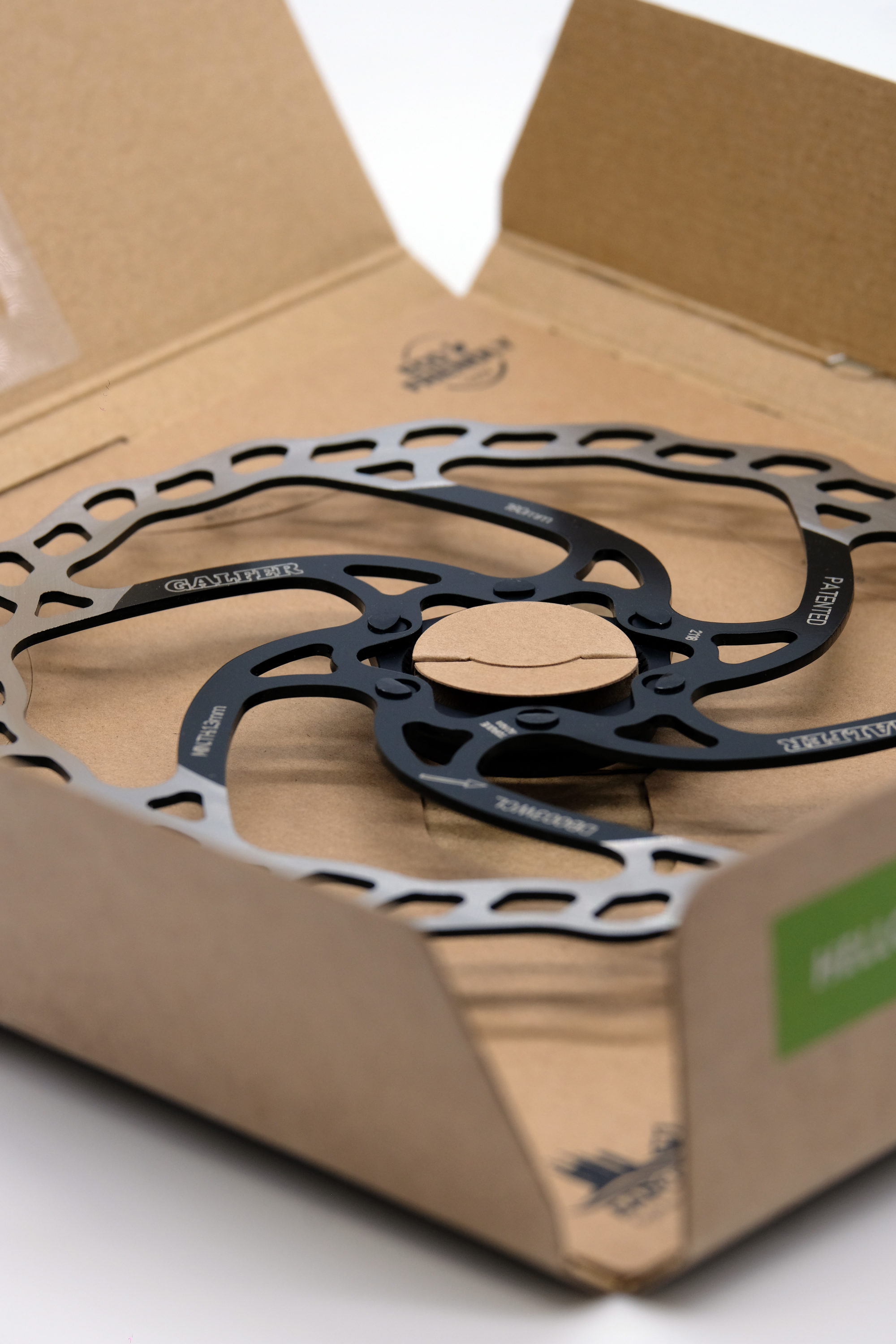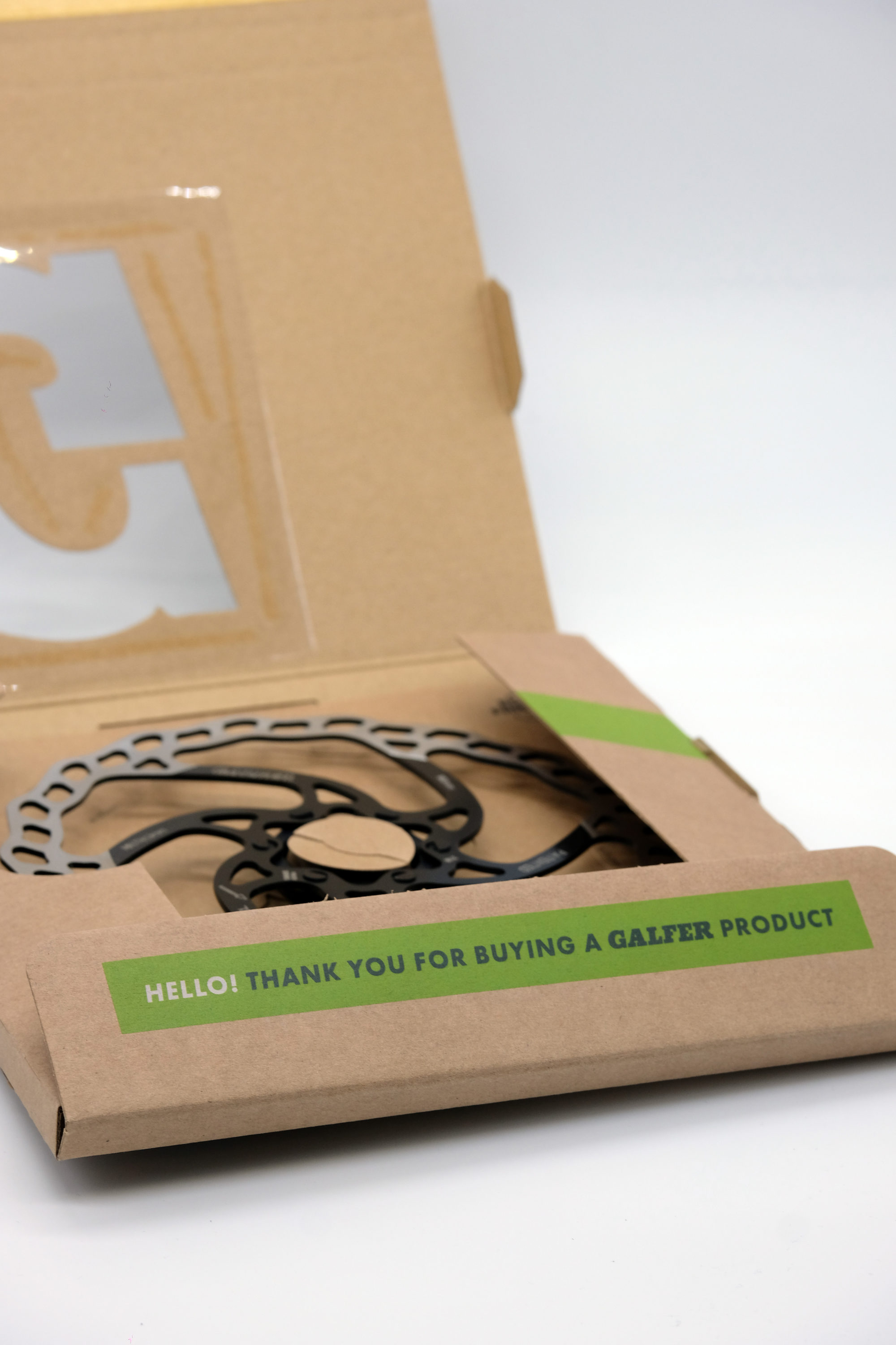 Brake component brand GALFER Bike has introduced a new packaging design for its bicycle disc brakes. The packaging, a box with a spine, is made from 100% organic materials and is considerably more durable.
