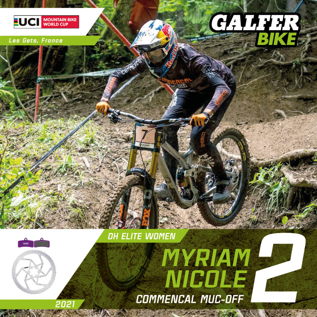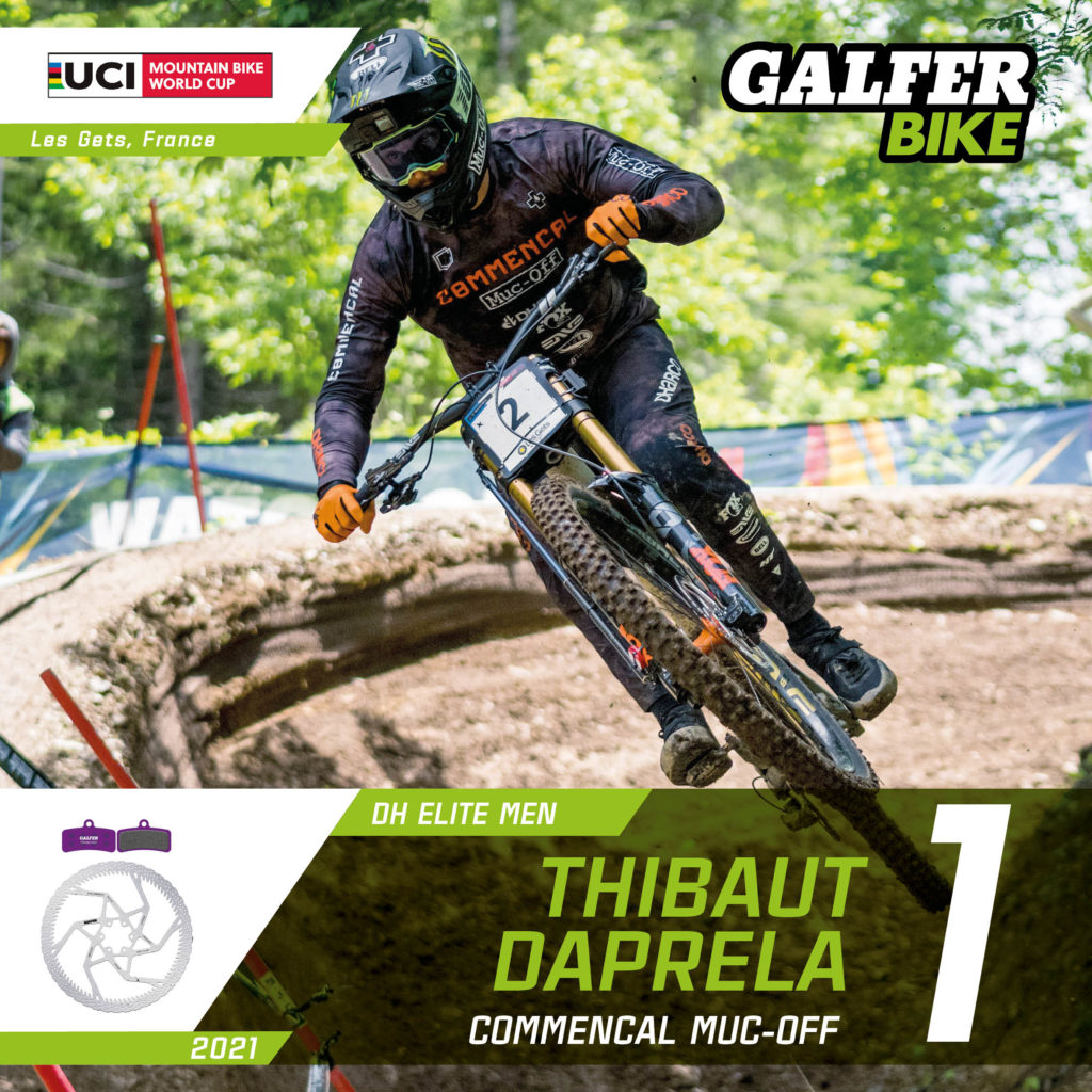 In the Downhill event, there was a spectacular victory by Thibuat Daprela (Commencal/Muc-Off) who put together an excellent downhill race, although he enjoyed better conditions than some of his rivals, who were affected by the rain that began to fall during the final stretch of the race. Daprela, who came to Les Gets after a recent face injury, clocked a time of 3:33 in the final, two seconds better than the runner-up with his Commencal prototype Supreme DH 29”, also equipped with the experimental GALFER Bike DBP21007I ø223×2.0 mm brake discs. This meant the young French rider, at only 20 years of age, notched up his first victory in a UCI DH World Cup in the Elite Men’s category, the second in history for a GALFER Bike representative. Thibaut Daprela is also now the leader of the world’s premier downhill category, thanks to one victory and one podium finish in the two races run this season.