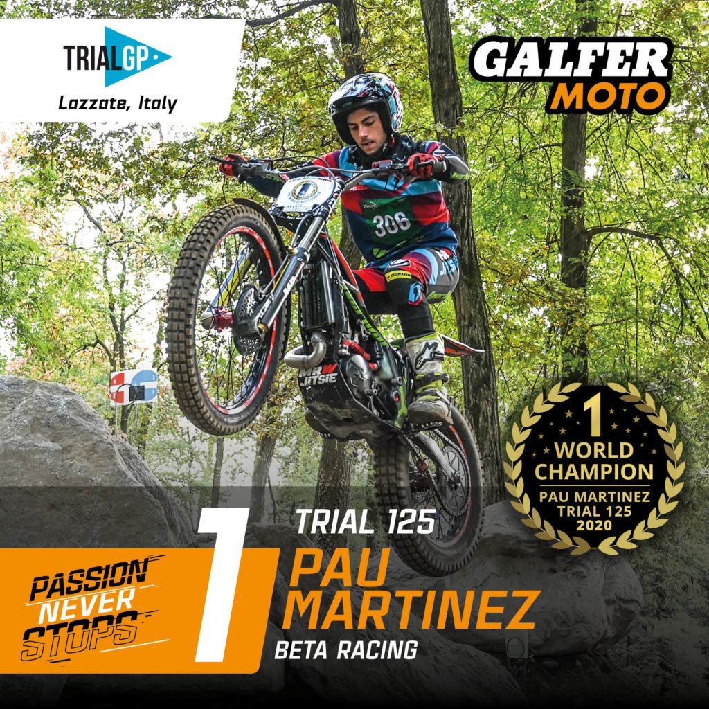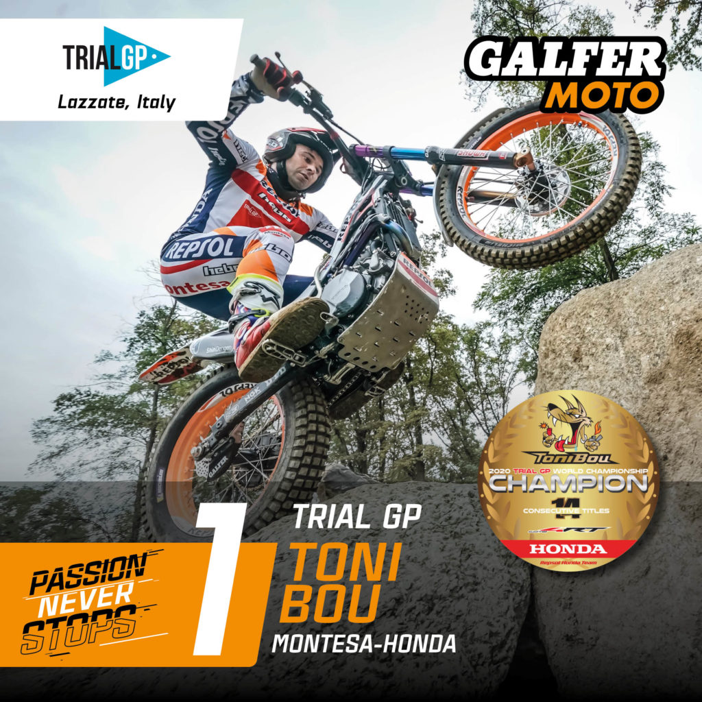 Toni Bou (Montesa-Honda) won his 28th world Trial title, his 14th in TrialGP, while Matteo Grattarola (Beta Trial) and Pau Martínez (Vertigo) were crowned world champions in the TR2 and 125cc categories, respectively.