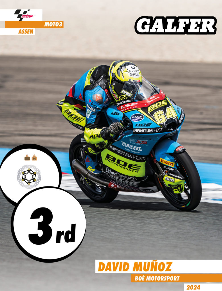 In Moto3, Iván Ortolá (MT Helmets-MSI) achieved his first victory of the season in a thrilling photo finish, beating Veijer by just 12 thousandths of a second. Starting from the second row, Ortolá stayed in the leading group and, in the last lap, made a decisive and spectacular overtaking maneuver. David Muñoz (Boe Motorsport) also shone, securing third place on the podium with a sensational performance. Both riders relied on the advanced Galfer Floatech® brake discs and the efficient Racing G1310 sintered brake pads, which offered superior performance. Ortolá now sits in fourth place in the championship, 51 points behind the leader.