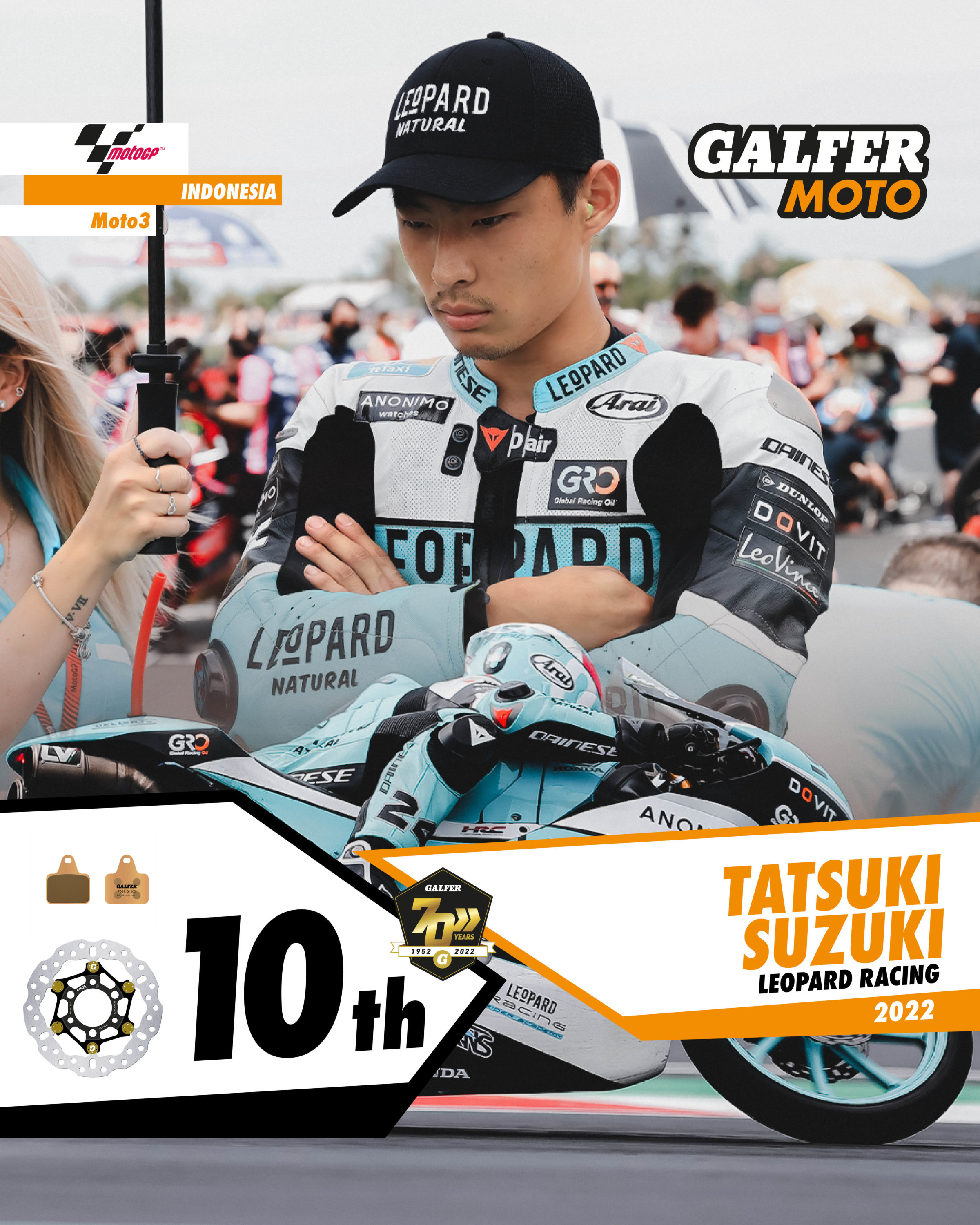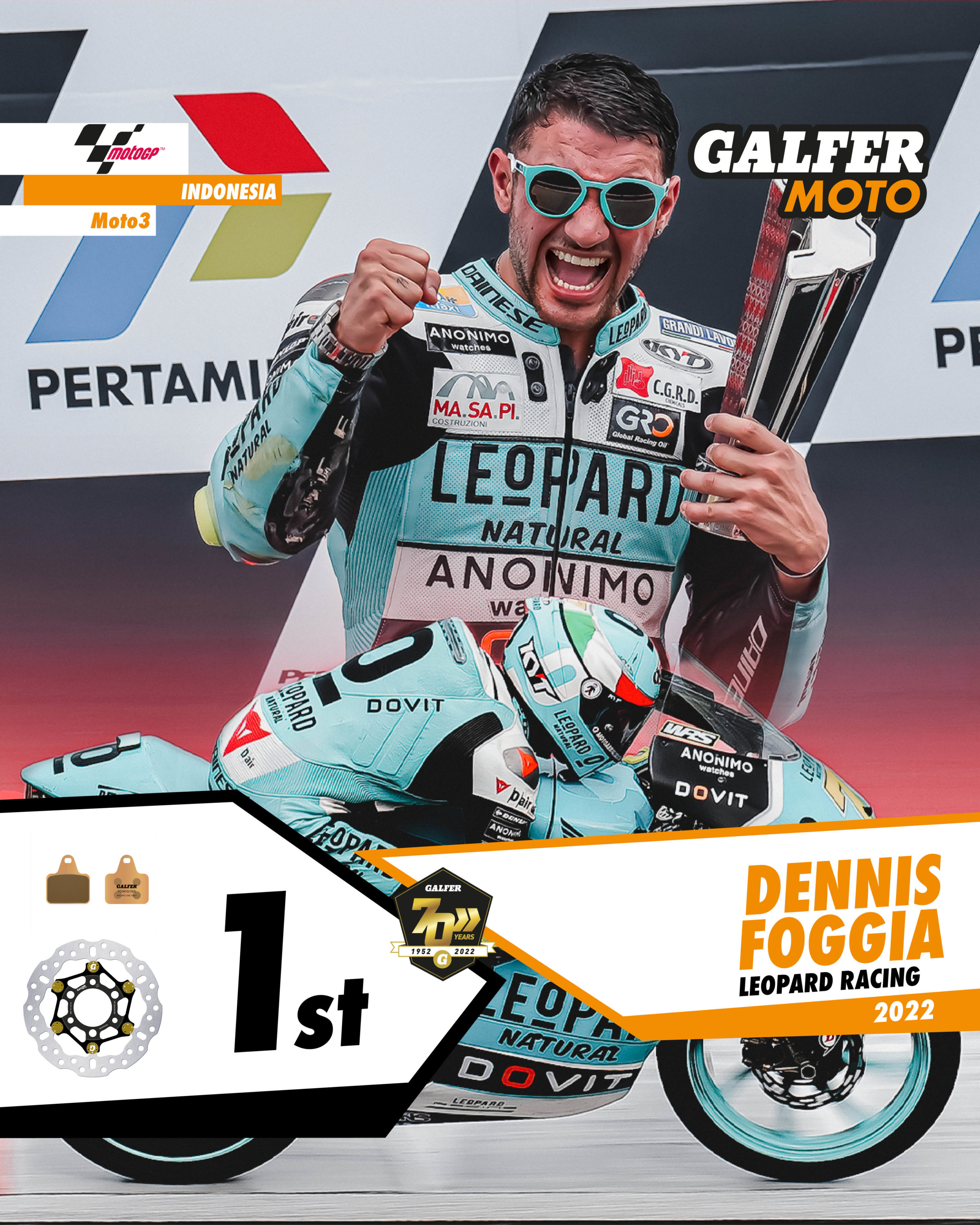 The Indonesian MotoGP Grand Prix was characterised by high temperatures, high humidity and changing track conditions throughout the weekend. Despite these difficulties, Galfer rider Dennis Foggia (Leopard Racing) managed to break away from the pack during the opening laps to lead the Moto3 race and take an uncontested victory. Foggia set a strong pace and built up a 5 second lead over the chasing pack, which allowed him to win the race comfortably on his Honda HRC Moto3 equipped with Floatech® discs, Racing sintered pads and Galfer brake lines. In addition, Dennis Foggia has taken the provisional lead in the Moto3 World Championship, with a one-point advantage after two GPs.