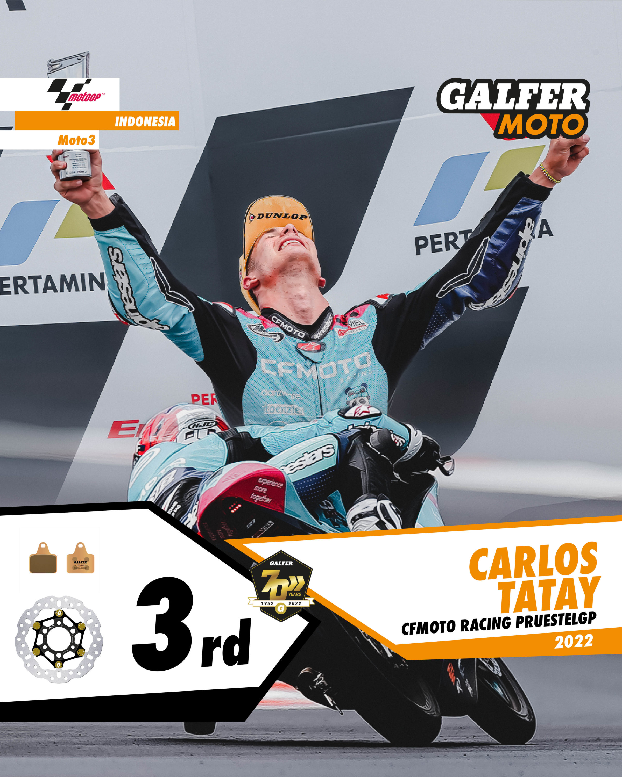 On the other hand, it is worth mentioning the impressive performance by Spanish rider Carlos Tatay (Prüstel GP), who made it to the third step of the podium after a great comeback during the race. Tatay, who started from pole-position, had a weak start and was also penalised with one long lap. Nevertheless, Carlos was able to come from behind to reach the podium in the last lap on his KTM Moto3 bike, also equipped with Galfer brake products.