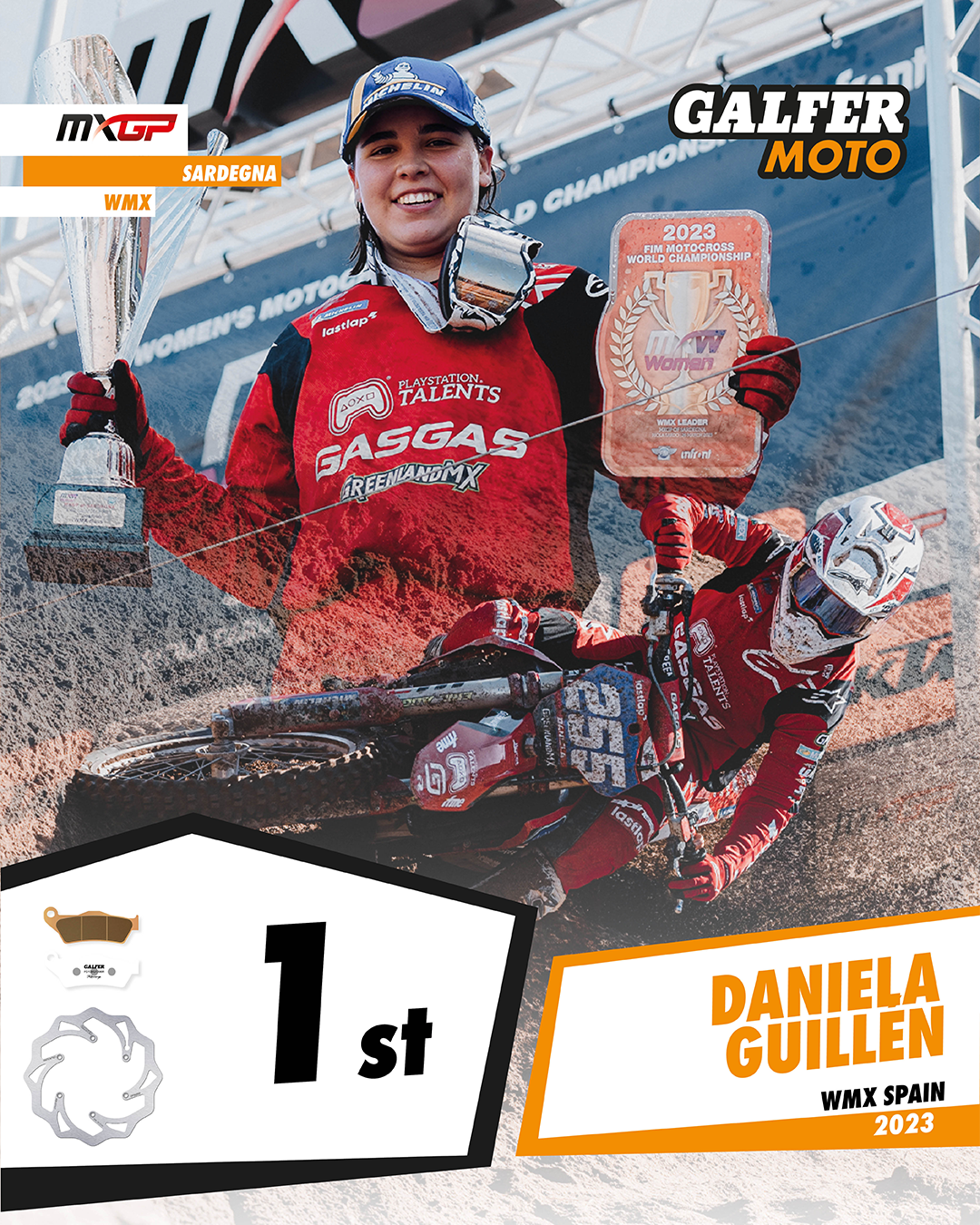 Daniela Guillén beat the reigning world champion in the first race of the season to take the lead in the championship ahead of three other Galfer riders for a total of four top tens and one first place in the first race of the WMX 2023.