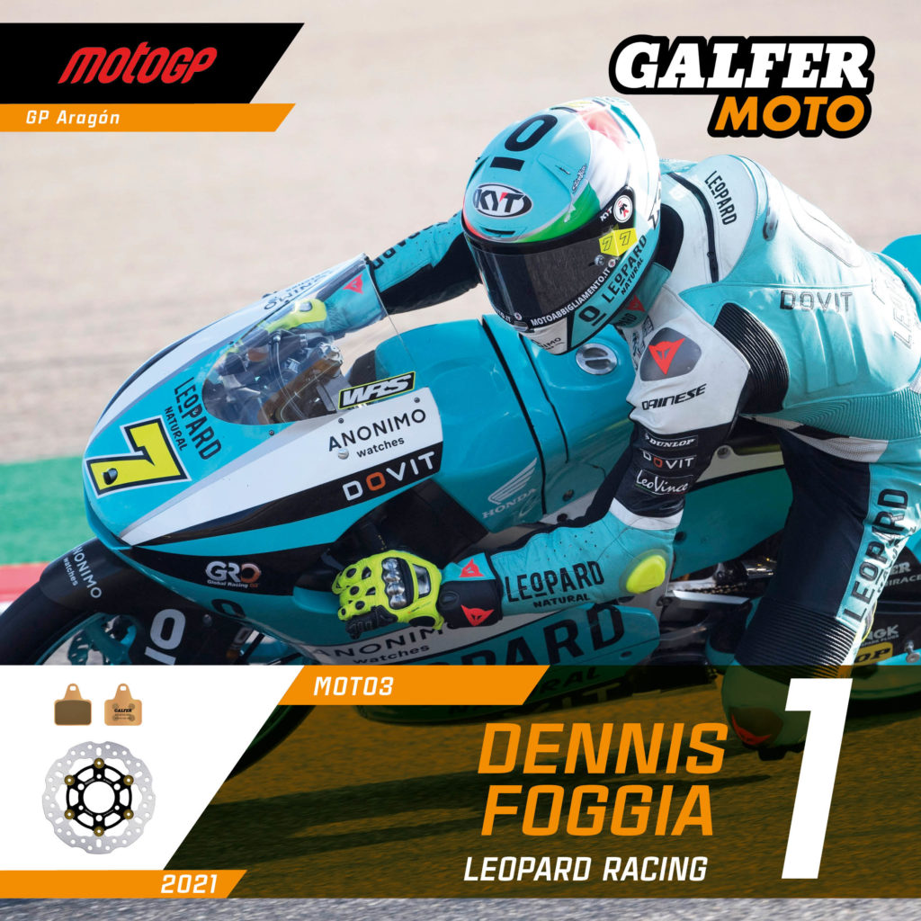 It was another excellent performance by Dennis Foggia (Leopard Racing) in the Aragon Moto3 GP at MotorLand. Dennis, who started from 14th position on the grid, once again charged through the pack on his Honda HRC equipped with GALFER disc brakes and pads to take the win. In an eventful race, where the top two riders in the overall standings both crashed out, Foggia was able to hold his nerve and put in a sensational last lap. Thanks to his GALFER brake components, Dennis Foggia was able to overtake Öncü in the final corner and win by just 0.041 seconds. With this victory and Acosta and García failing to finish, Foggia now lies third in the overall standings, 58 points behind the leader, and is the rider with the most podium finishes in the category this season.