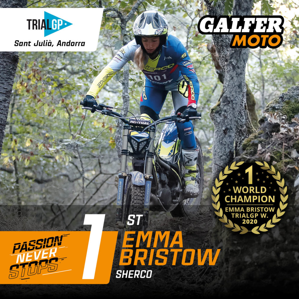 British rider Emma Bristow and her Sherco fitted with GALFER brake components achieved a 7th consecutive TrialGP title thanks to a double victory in the Andorra GP.