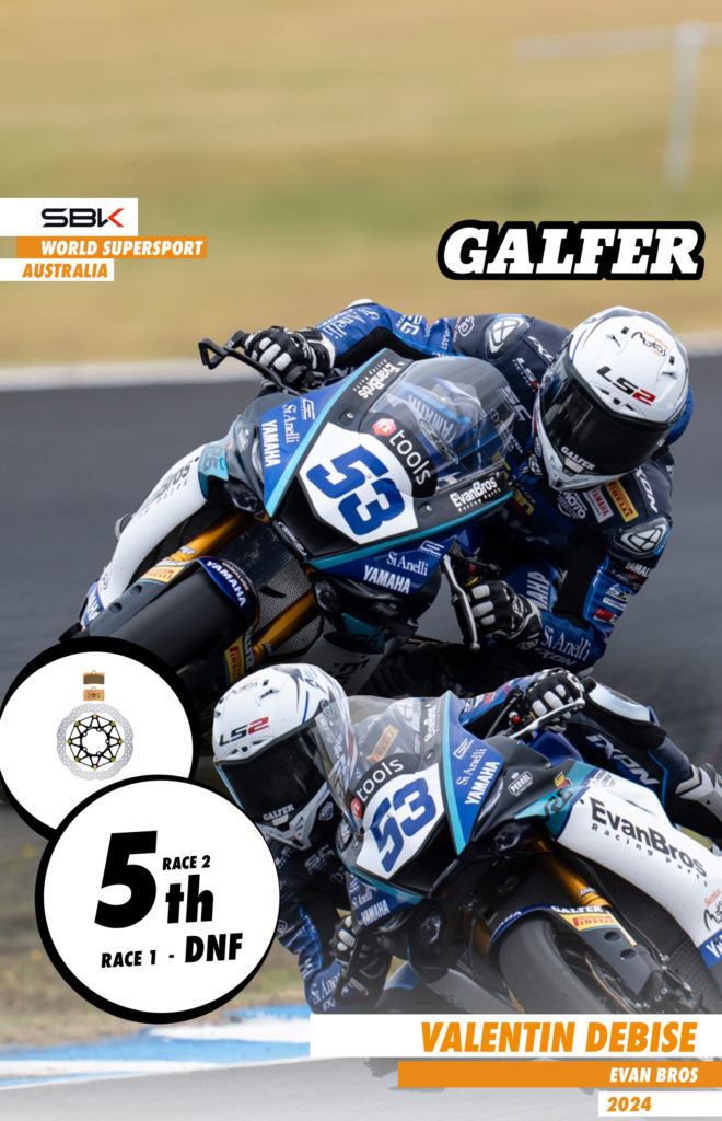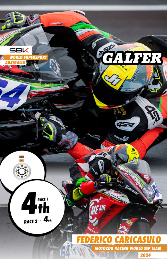 Focusing on the results of the weekend, it is usual to observe numerous changes, both on the grid and in the pits at the beginning of each season. Among the Galfer riders for the 2024 season, it is worth noting the new collaboration with the Motozoo ME AIR Racing team, whose new MV Agusta F3 800 RR bikes are equipped with Floatech® discs and G1310 Racing pads, thus contributing to the impressive performance of Federico Caricasulo, who reached third position in the overall standings after achieving two consecutive fourth places in both races. On the other hand, his teammate Luke Power did not participate in this Australian Grand Prix.