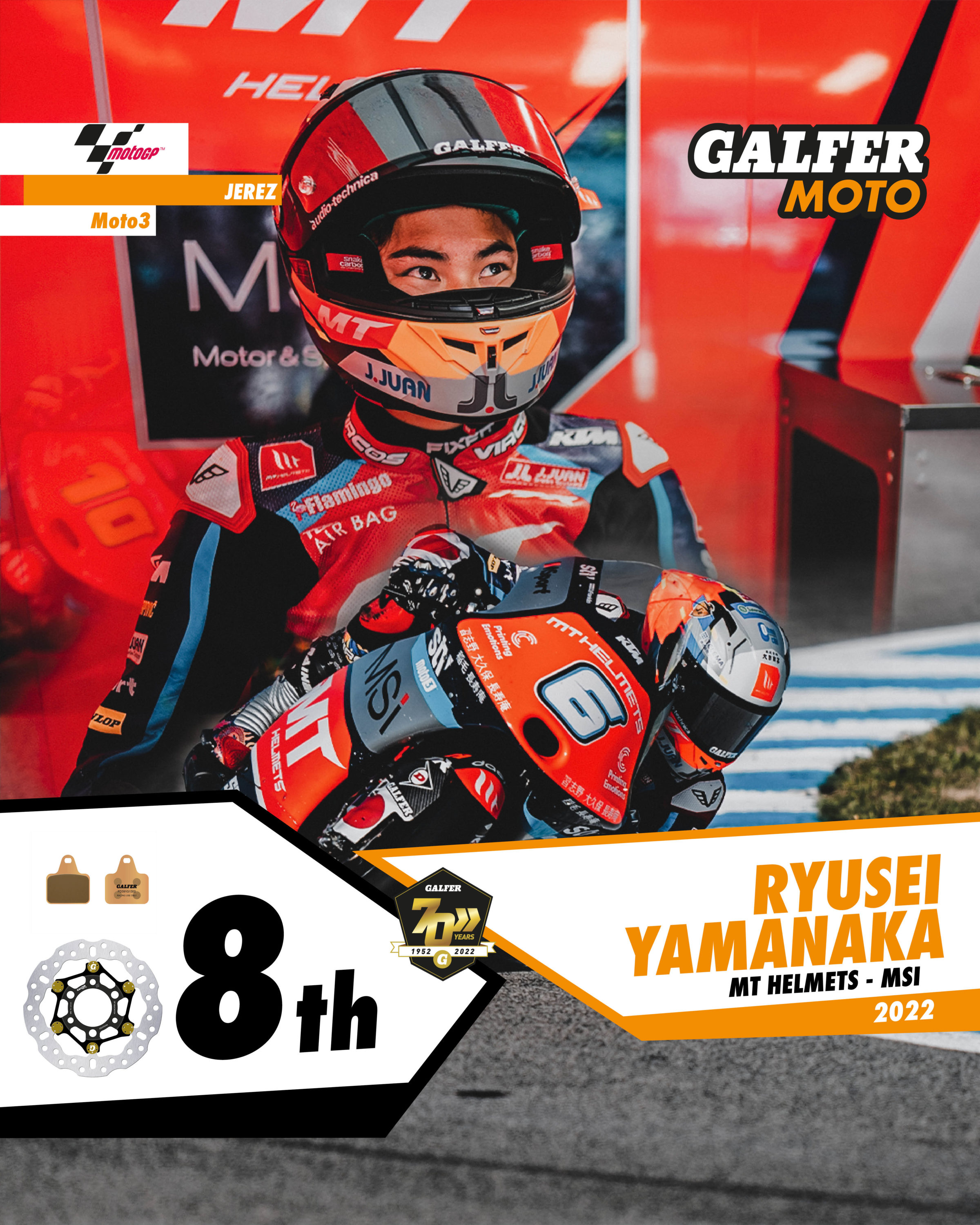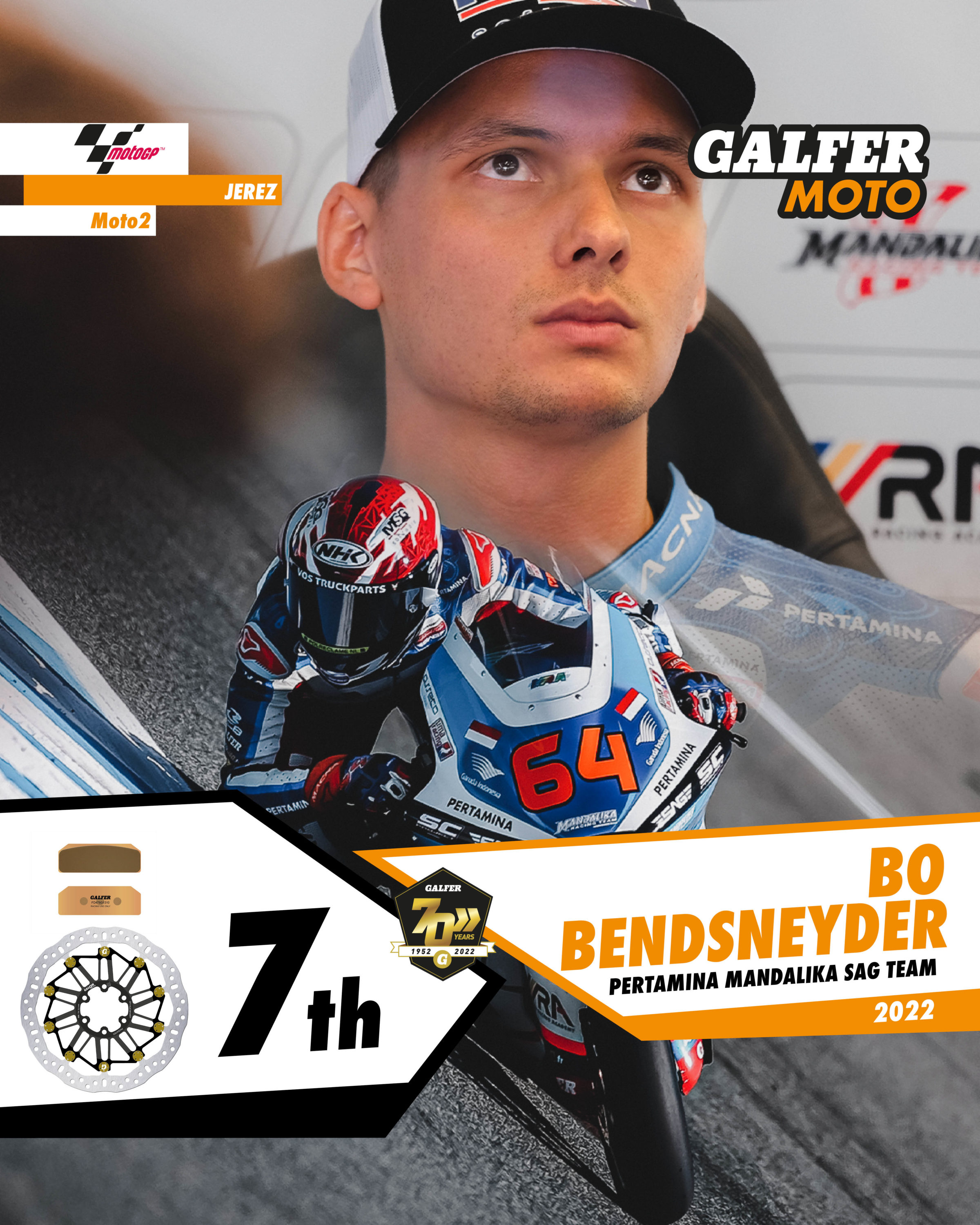 In Moto2, Bo Bendsneyder, Dutch rider with the Stop and Go team, started from eighth place on the grid thanks to a good practice session. A very solid race, with highly consistent lap times, saw him finish in a creditable seventh position, thanks, among other things, to his Galfer brake discs with Floatech® technology and Racing sintered brake pads. His teammate, Gabri Rodrigo (#2) failed to score any points, finishing in 17th position.