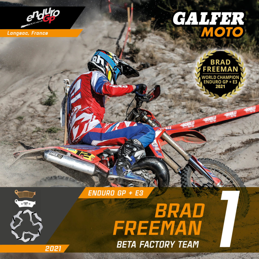 A great season in 2021 for British rider Brad Freeman and his Beta Factory team. Freeman went into the final round in Langeac (France) under pressure from Josep García after four consecutive wins, but Brad had a spectacular weekend, winning Friday’s Super Test and the second round on Sunday to finish 18 points ahead of García and take the overall championship. Freeman also won the world championship in his category (E3) ahead of Jaume Betriu (WP KTM). Brad Freeman is therefore the new EnduroGP world champion, succeeding his teammate Steve Holcombe, both using GALFER brake components on their Beta: Disc Wave® RW and Racing Off-Road G1396R sintered brake pads.