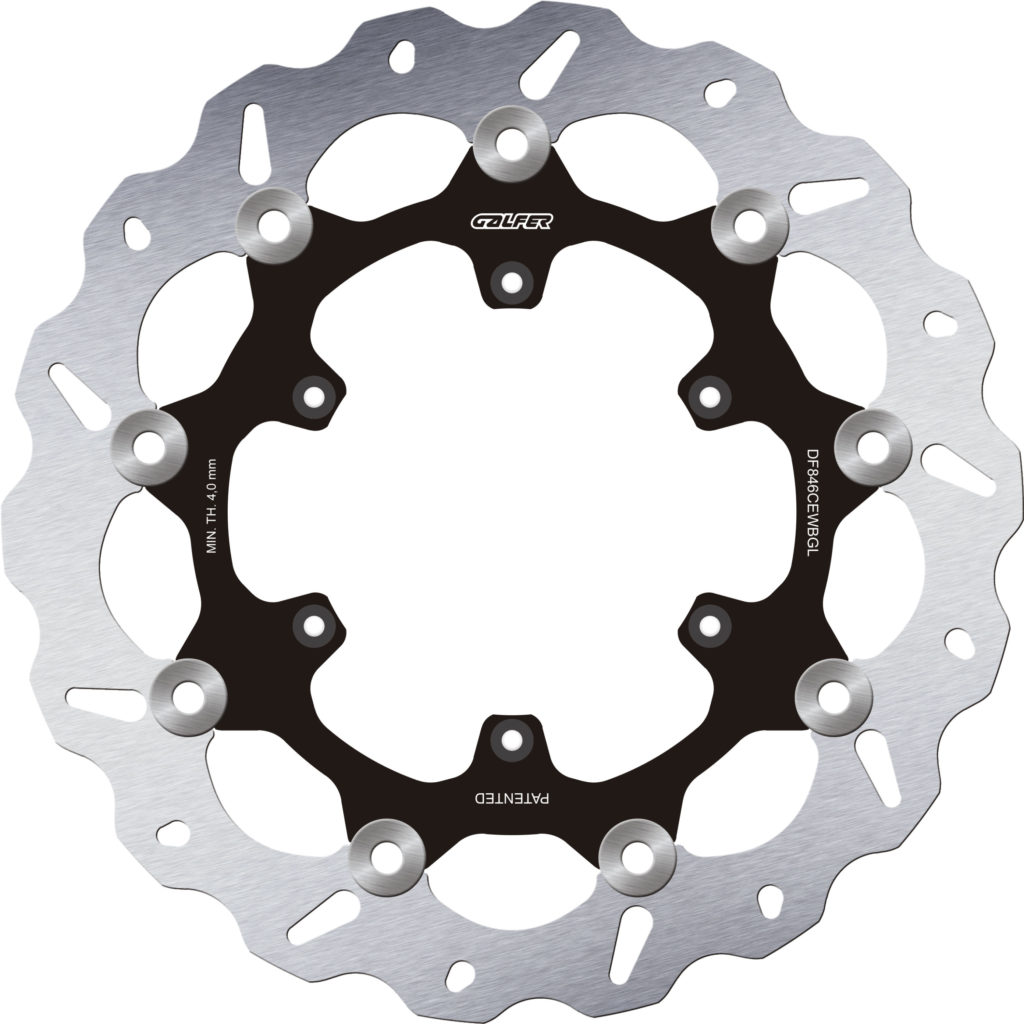 • Floating disc with aluminum core to reduce weight (P = 1.23 kg) and improve front-wheel handling.