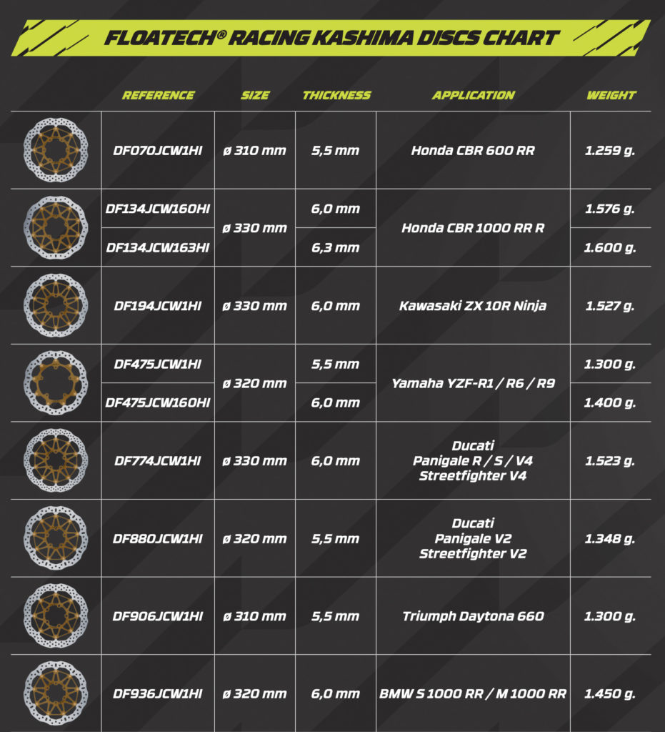 Download catalogue: https://galfer.com/moto/wp-content/uploads/sites/2/diptico-floatech-racing-kashima.pdf