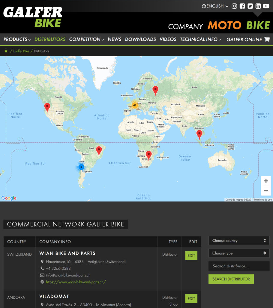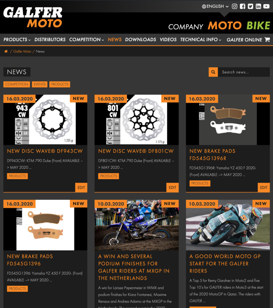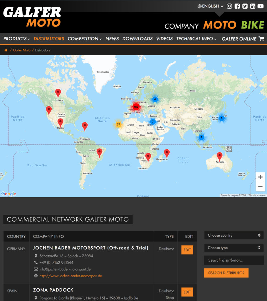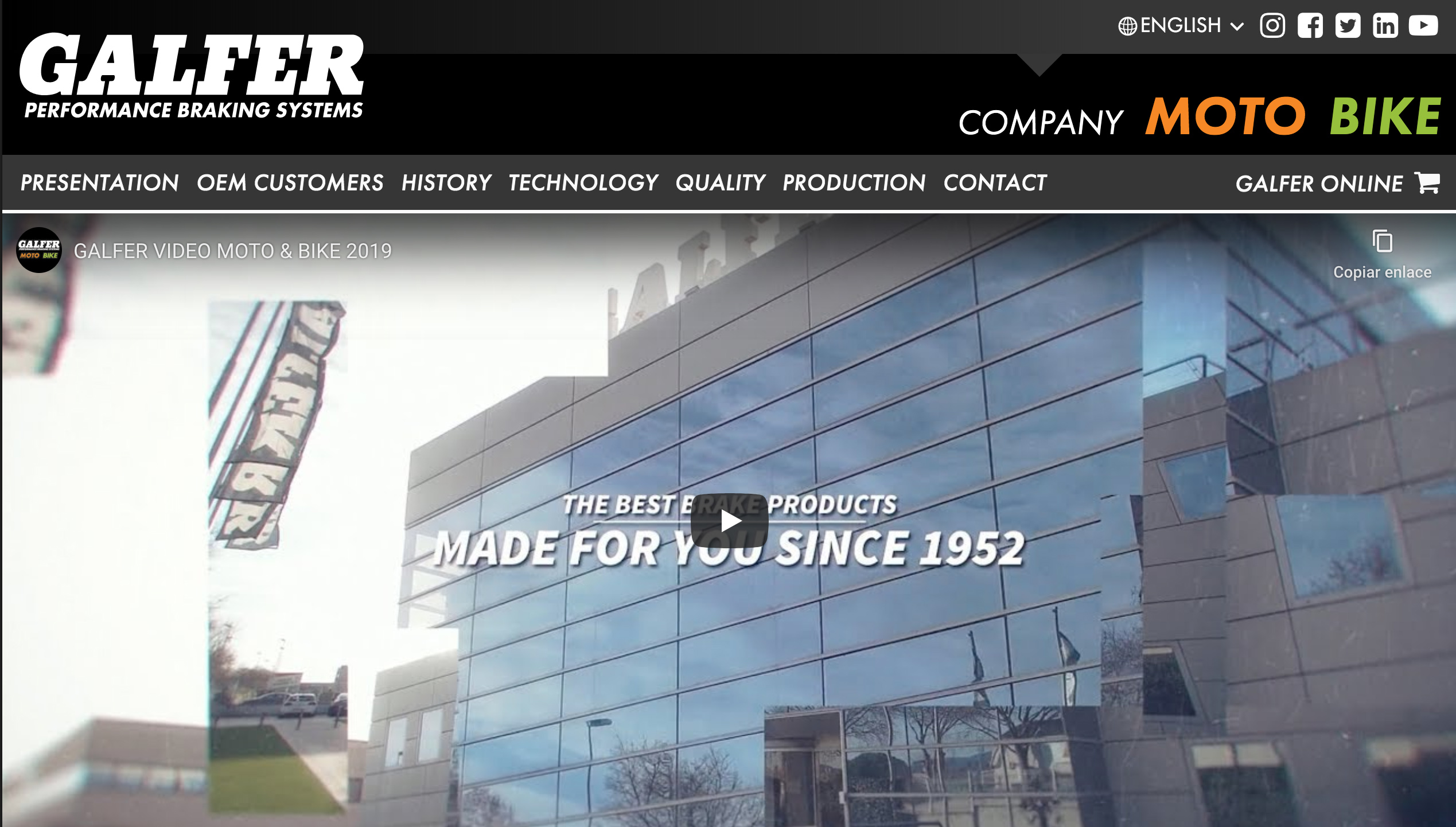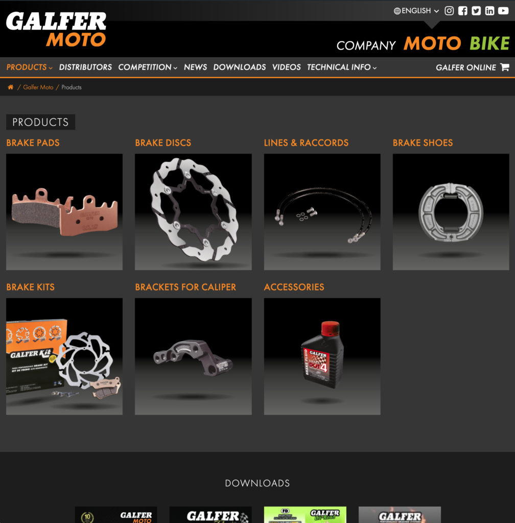In addition, the GALFER website contains comprehensive information about the company (introduction, history, technology, quality and production), its entire range of brake products, its distributors, the competition teams and riders, news on sports, products and events, and downloadable manuals, catalogues, logos, as well as a range of other useful information.