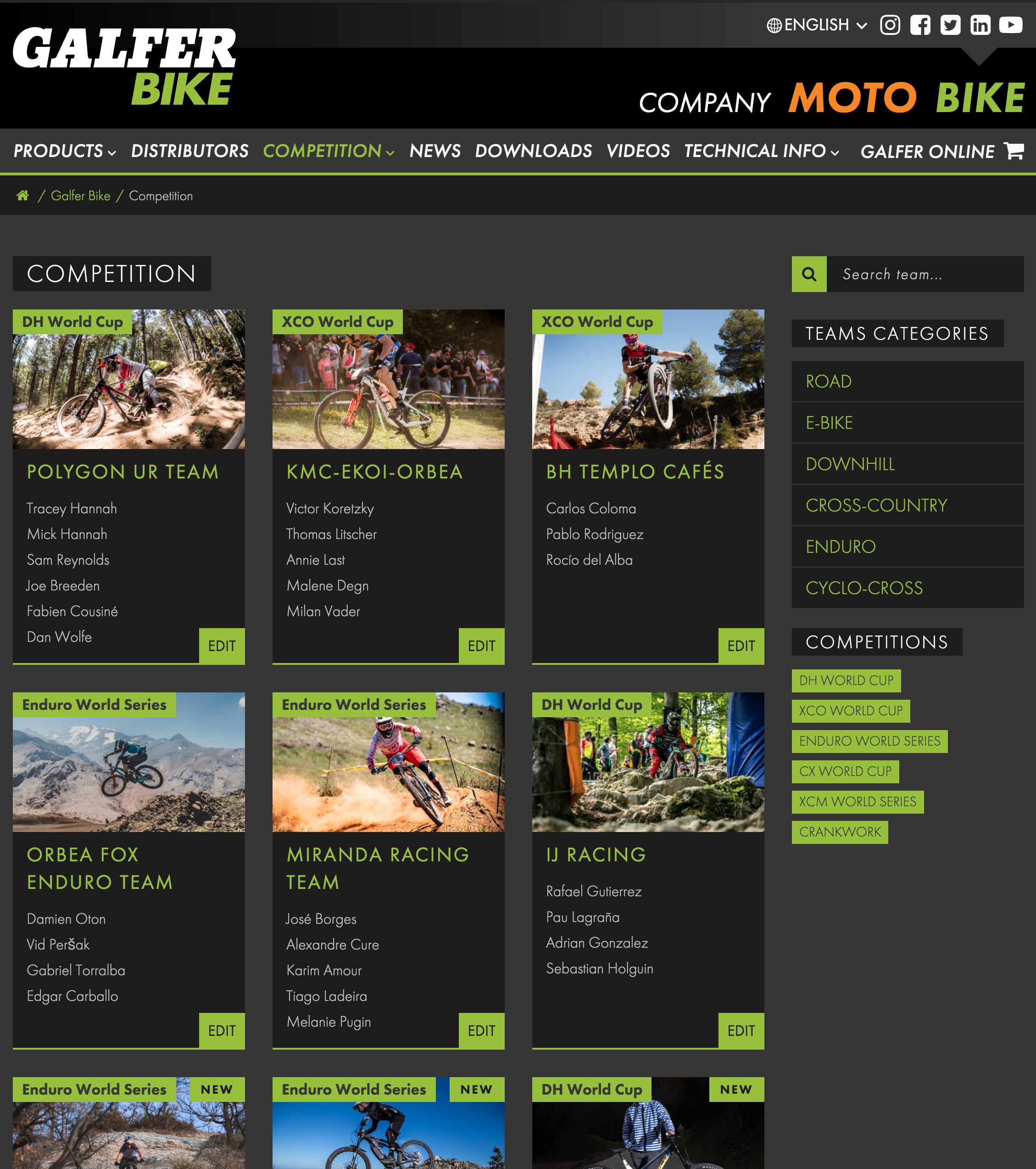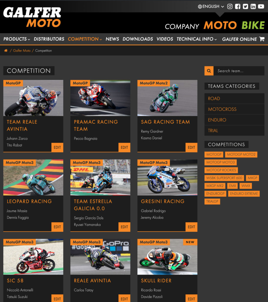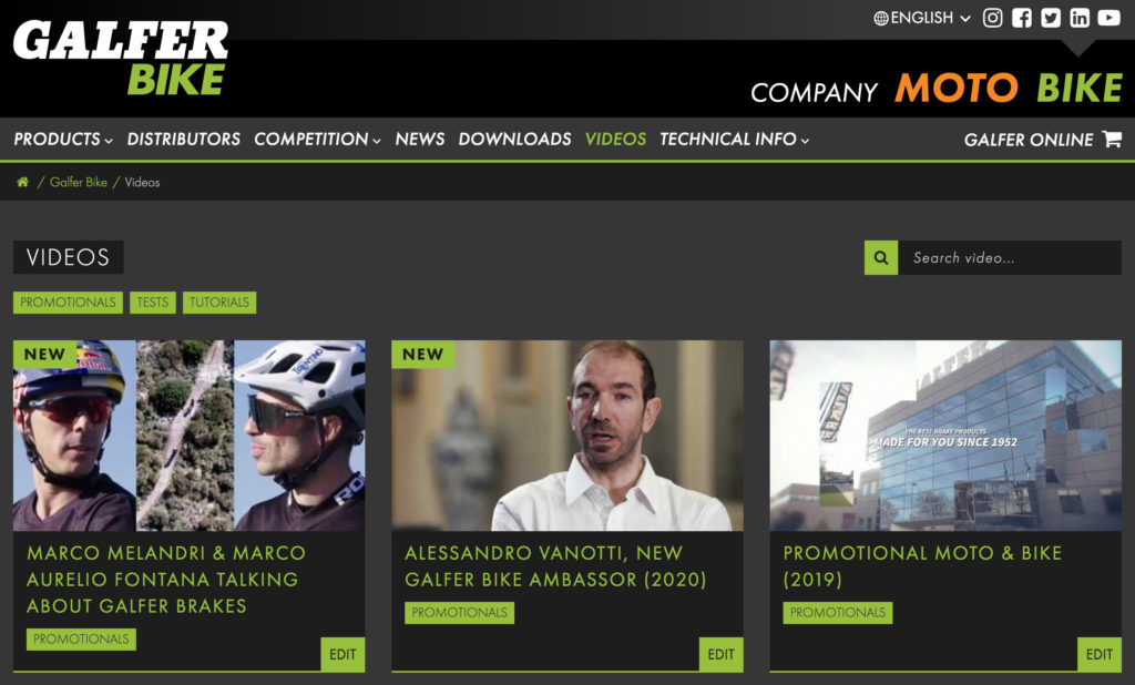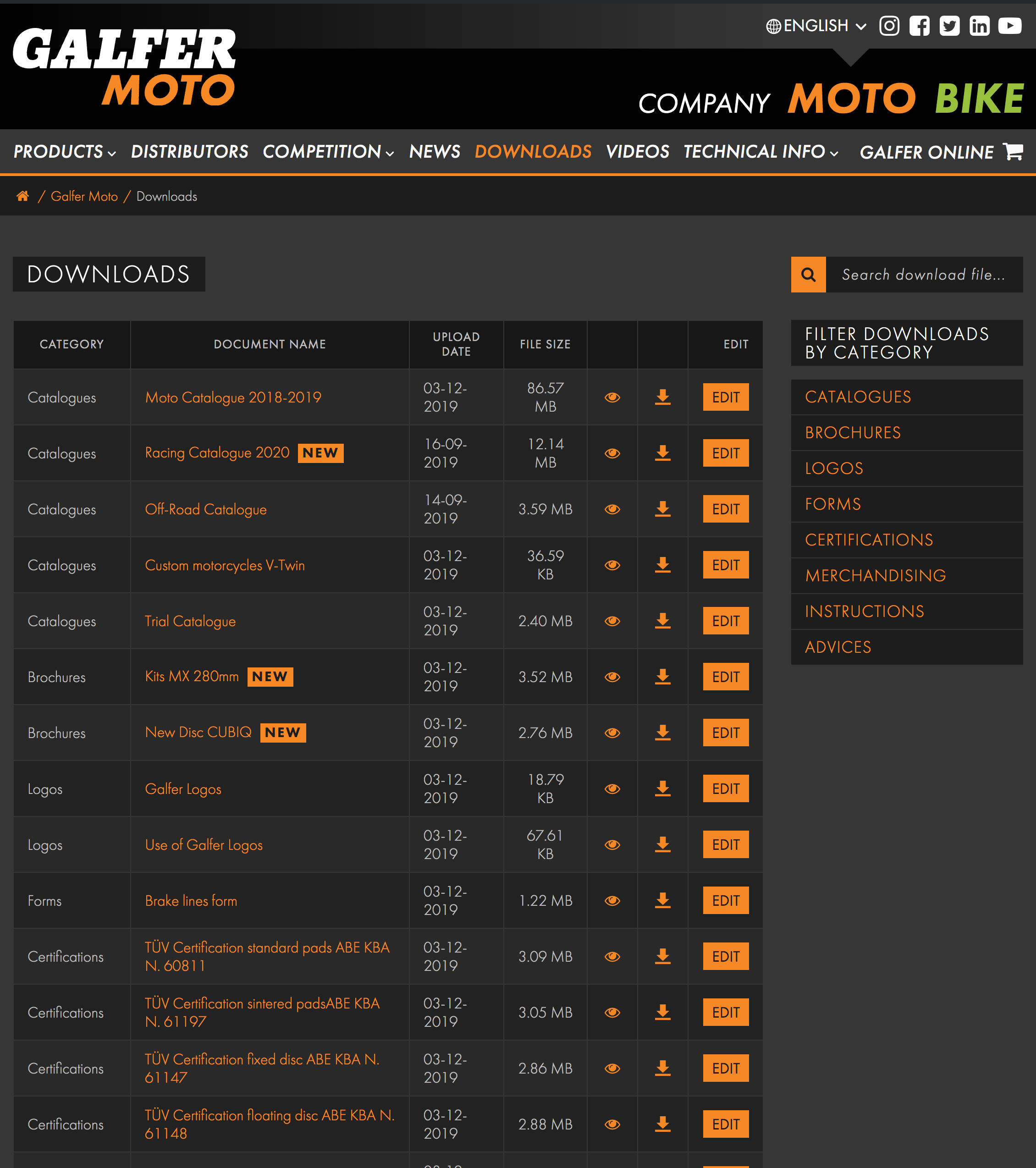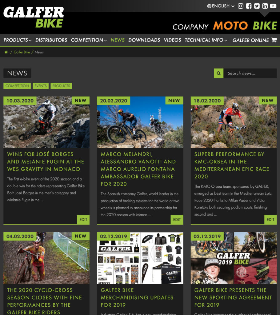 In addition, the GALFER website contains comprehensive information about the company (introduction, history, technology, quality and production), its entire range of brake products, its distributors, the competition teams and riders, news on sports, products and events, and downloadable manuals, catalogues, logos, as well as a range of other useful information.