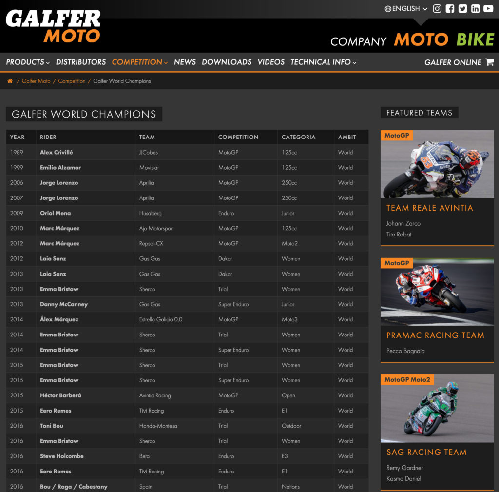 List of Motorcycle/Bike World Champions: a section on the GALFER riders who have won world championships while using brake products from the Spanish brand, organised chronologically and with detailed information about the year, team, speciality and category.