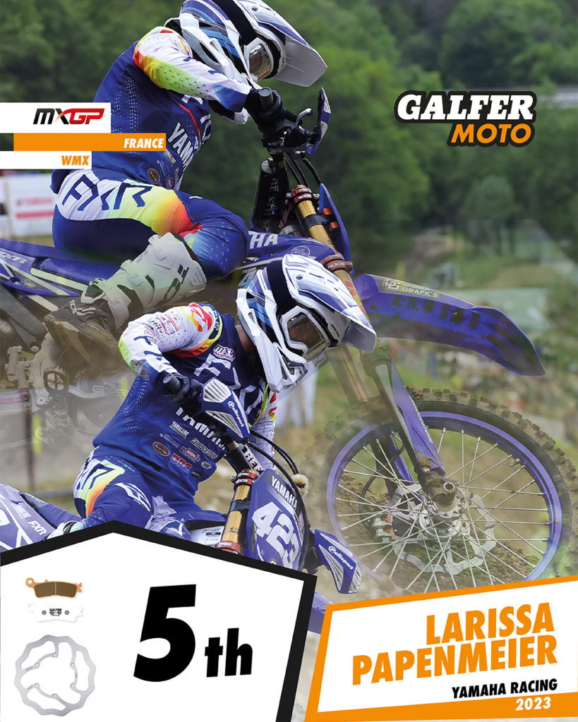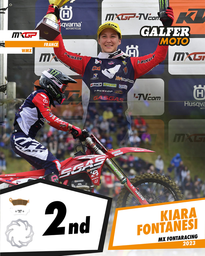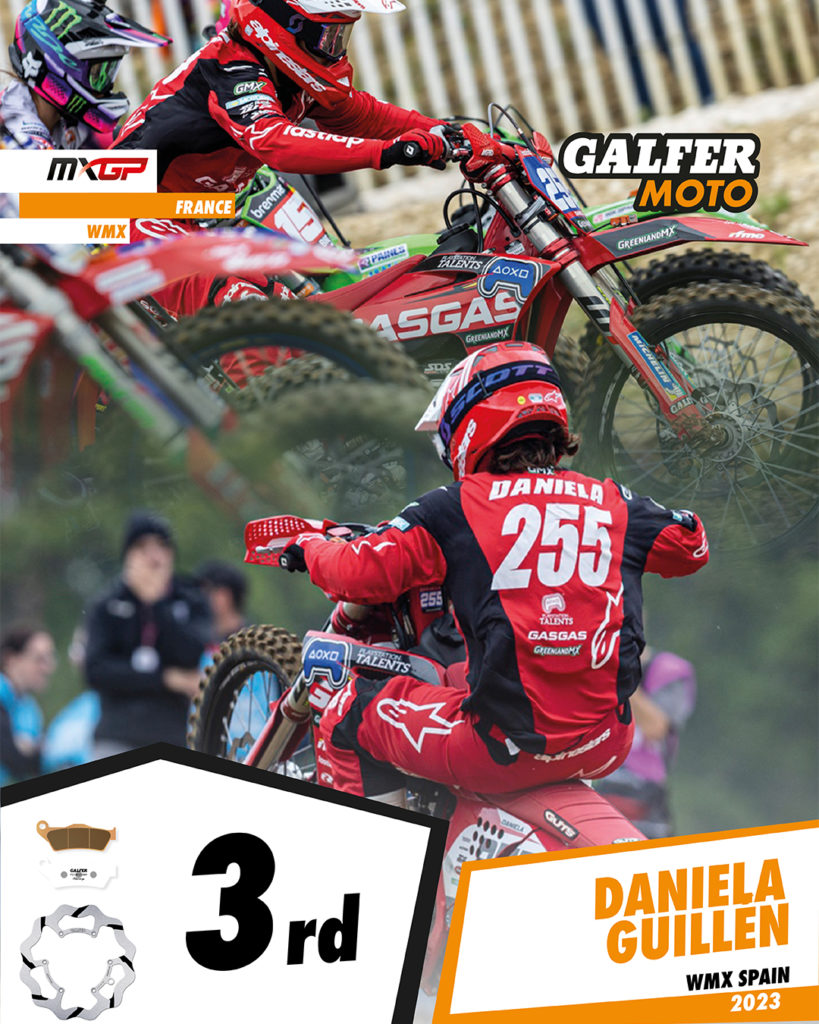 We got some glimpses of the old Kiara last weekend as, little by little, she finds herself back at the front of races, achieving two podiums in this Grand Prix. The Italian rider, on her Gas Gas bike equipped with Galfer brake products, took the holeshot on Saturday and finished second in both races. Behind Kiara was the young Spanish rider Daniela Guillén, who finished the weekend just 20 points adrift of the leader of the overall classification, who held on to first position. In the second race Daniela came back from thirteenth position to finish third. Her battle with the strongest riders on the grid ended with two third place finishes. Finally, the great performance by Larissa Papenmeier deserves a mention, finishing an excellent fifth.