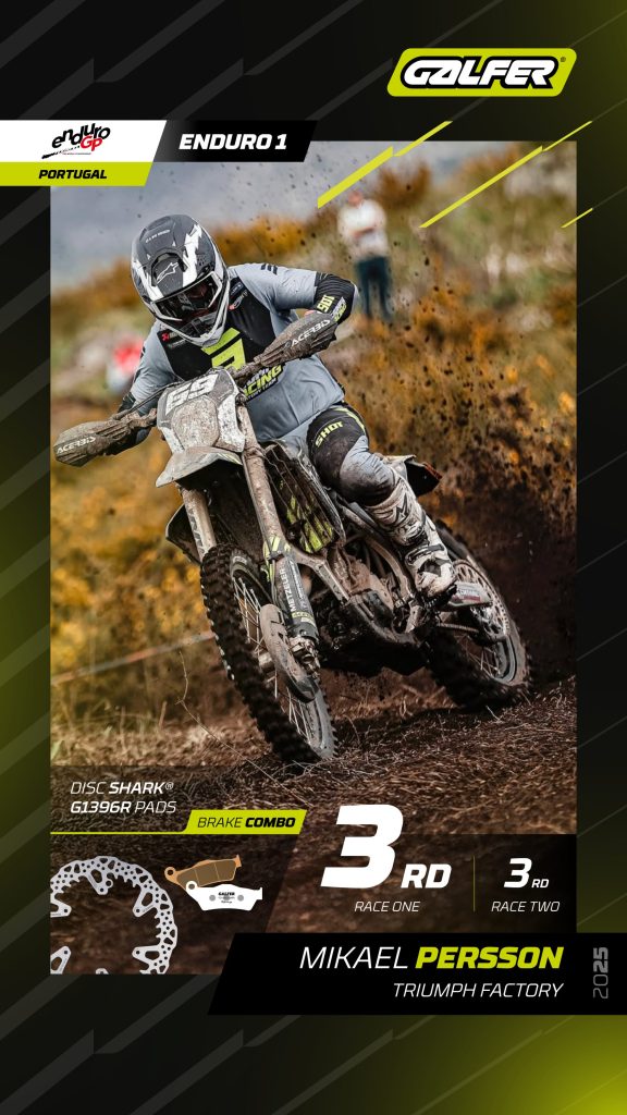 Mikael Persson (Triumph Factory Racing Enduro Team): Persson, riding in the blue tribe at a world debut with Triumph, won third position on each of the two race days in the Enduro1 category, highlighting Galfer brake performance under championship race conditions.