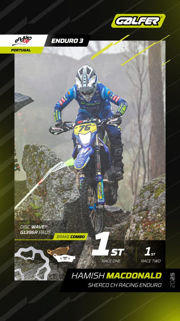 Sherco Factory Racing pilot Hamish Macdonald made it a great day for Sherco and Galfer in the Enduro3 class. On day one, he led an all-Sherco podium, trailed by teammates Antoine Magain and Julien Roussaly. On day two, Macdonald again proved unbeatable, further cementing his title position.