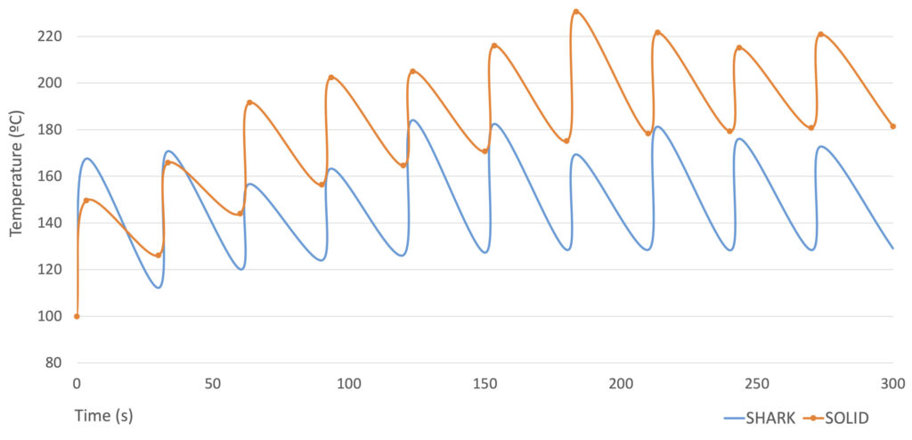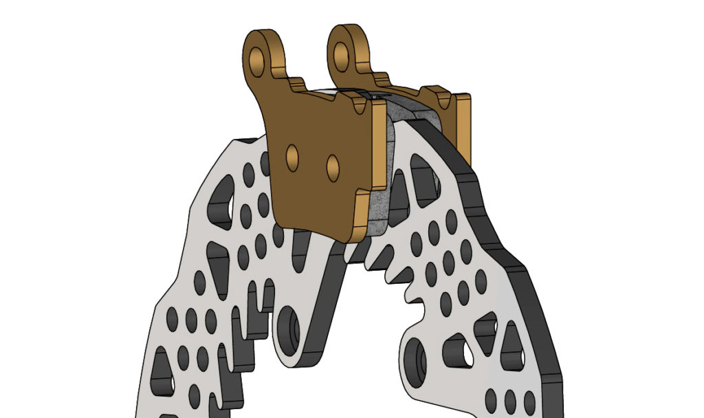 The “Disc Shark®” introduces optimised heat dissipation by increasing the contact area via small holes, fins and greater thickness. This development results in a drastic reduction in temperature during use, which allows the hydraulic fluid to maintain its stability. This stability, in turn, contributes significantly to prolonging the life of the brake pads.