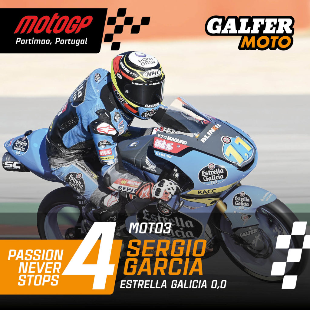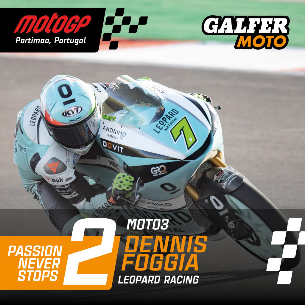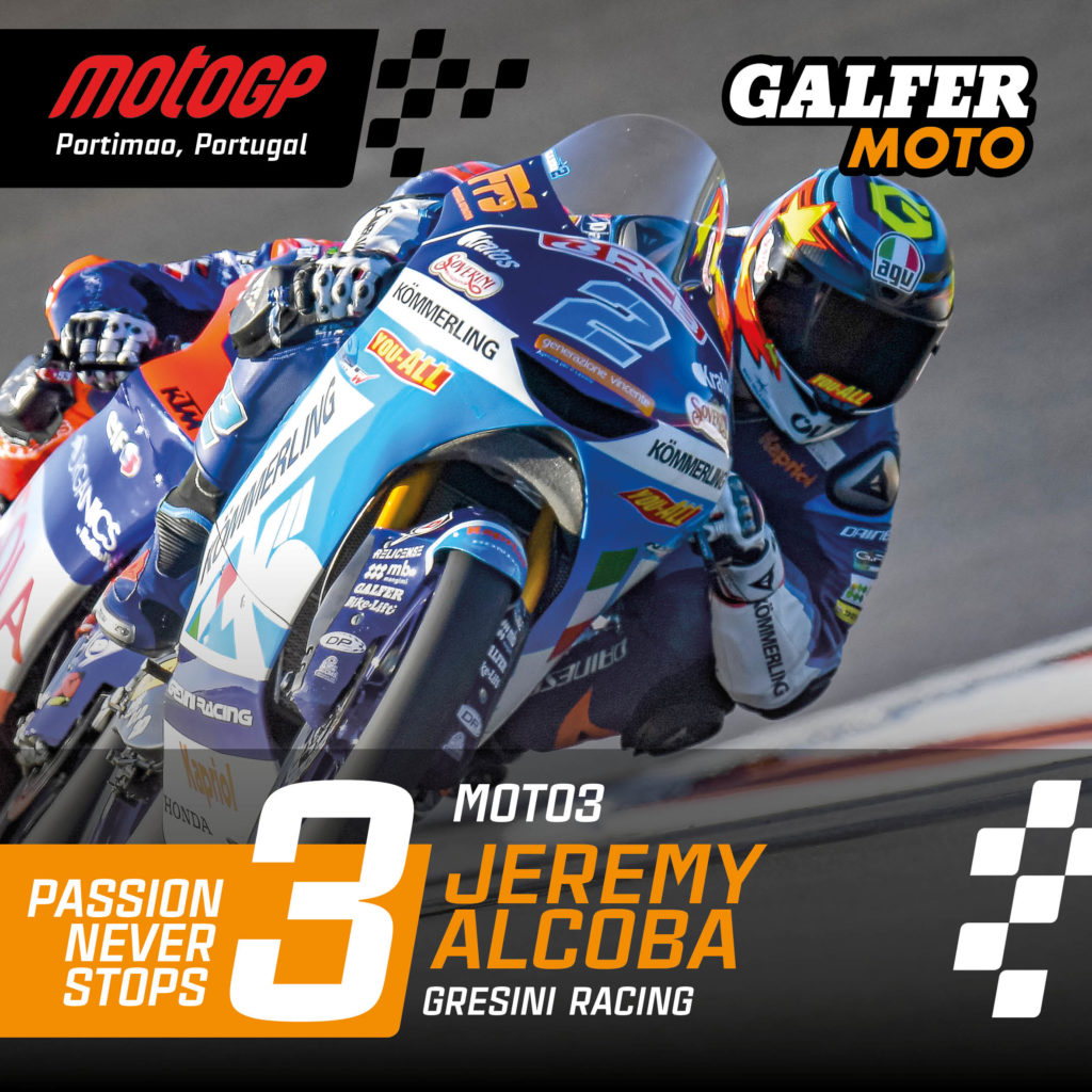 There was a double-podium finish in the Moto3 category for GALFER riders, thanks to Dennis Foggia (Leopard Racing) who finished 2nd, and Jeremy Alcoba (Gresini Racing) who finished 3rd. Dennis Foggia was forced to do a double long-lap penalty, but despite this he managed to make up over 15 positions to finish second in the race in Portimao. In addition, Jeremy Alcoba claimed his first world championship podium finish with an excellent third place. And we should also mention the fourth place finish of Sergio García and the Monlau Competición team, who now bid farewell to the world of motorcycling after participating for nine consecutive years, always with the support of GALFER.