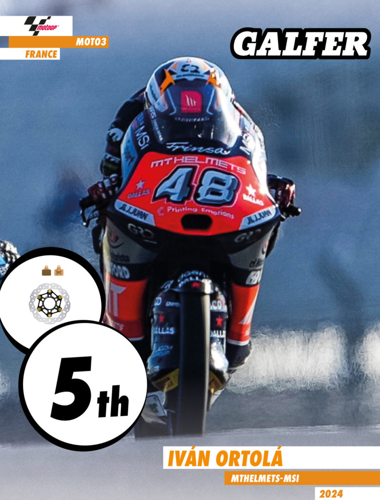 On the other hand, in the Moto3 category, Galfer riders couldn’t reach the podium despite fighting for it. The best-placed was Spanish rider Iván Ortolá (MT Helmets – MSI) in 5th position. Behind him, two more Galfer riders with Adrián Fernández (Leopard Racing) in 6th and Ryusei Yamanaka (MT Helmets – MSI) in 7th.