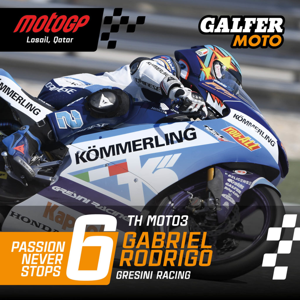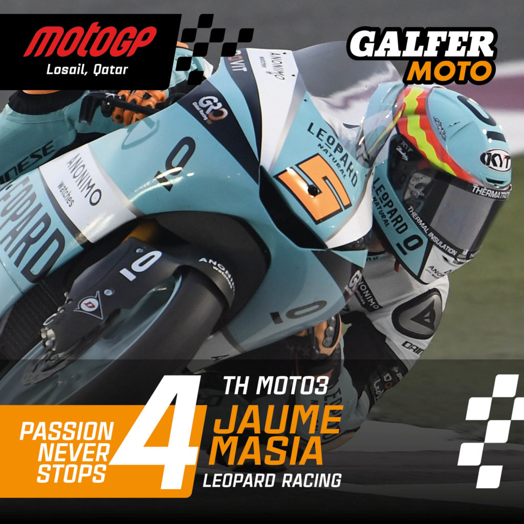 Buon inizio di stagione in MotoGP per gli interessi del marchio di freni GALFER. Nella categoria Moto3, la gara è stata caratterizzata dalla grande uguaglianza tra il gruppo di testa costituito da oltre 10 piloti diversi. Il pilota GALFER Jaume Masià (Leopard Racing) ha tagliato il traguardo in terza posizione, ma è stato penalizzato per aver oltrepassato i limiti della pista nell’ultimo giro, ed è stato relegato al quarto posto. Dietro a Jaume sono arrivati altri tre corridori GALFER: Tatsuki Suzuki (SIC58) 5° e piazzato in “pole position”, Gabriel Rodrigo (Gresini Racing) 6° e Jeremy Alcoba (Gresini Racing) 7°, che è stato anche il miglior “rookie”. Denis Foggia (Leopard Racing) ha concluso in nona posizione. Hanno tutti utilizzato dischi freno JCW1 Racing e tubi flessibili del marchio spagnolo.