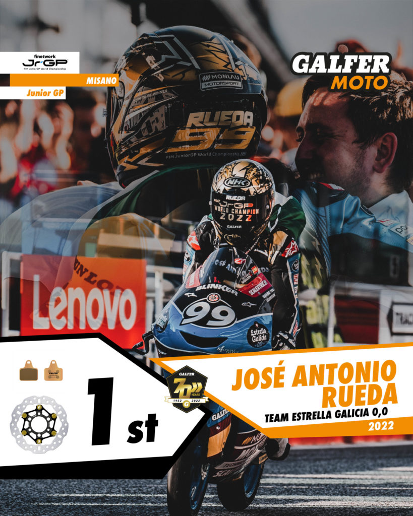 With two races remaining in the Finetwork FIM JuniorGP™ World Championship and following a frenetic weekend in Misano, Team Estrella Galicia 0,0’s José Antonio Rueda has been declared World Champion with a 90-point difference.