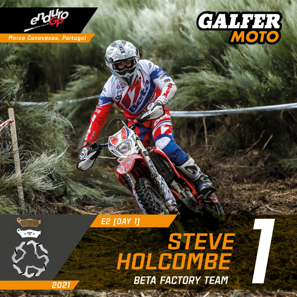 The E2 category saw intense competition between two GALFER riders: Steve Holcombe (Beta Factory) and Wil Ruprecht (TM Boano). Holcombe won on the first day, while Ruprecht won on the second, as well as recording the best time in the EnduroGP general classification on Sunday.