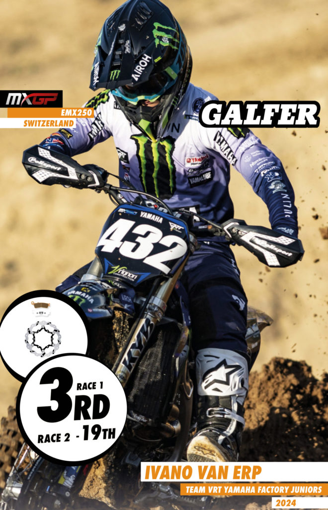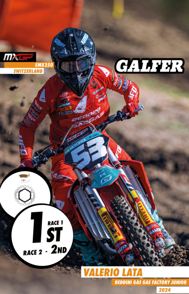 Valerio Lata (Beddini Gas Gas Factory Junior) showed his unstoppable form once again in MX250, clinching his fourth victory of the season and closing the gap in the championship standings. Lata, relying on the precise braking power of his Galfer discs and pads, won the first race on Saturday and secured a second-place finish on Sunday after a fierce battle with eventual winner Mathis Valin. Despite Valin’s (4-1) strong performance, the overall victory went to Lata.