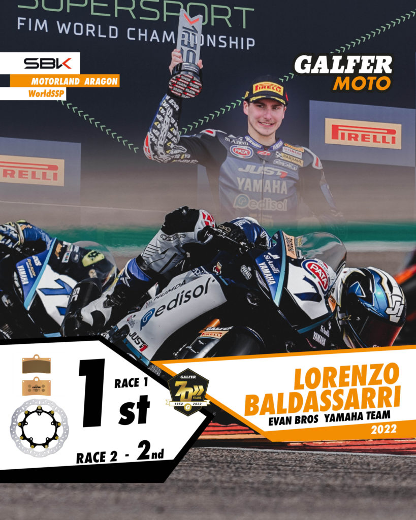 The Motorland Aragon circuit (Spain) played host to the first Grand Prix of the WSBK 2022, where Galfer rider Lorenzo Baldassarri (Evan Bros.) shone with 1st and 2nd place finishes in the two races held on the day of his debut in the competition.