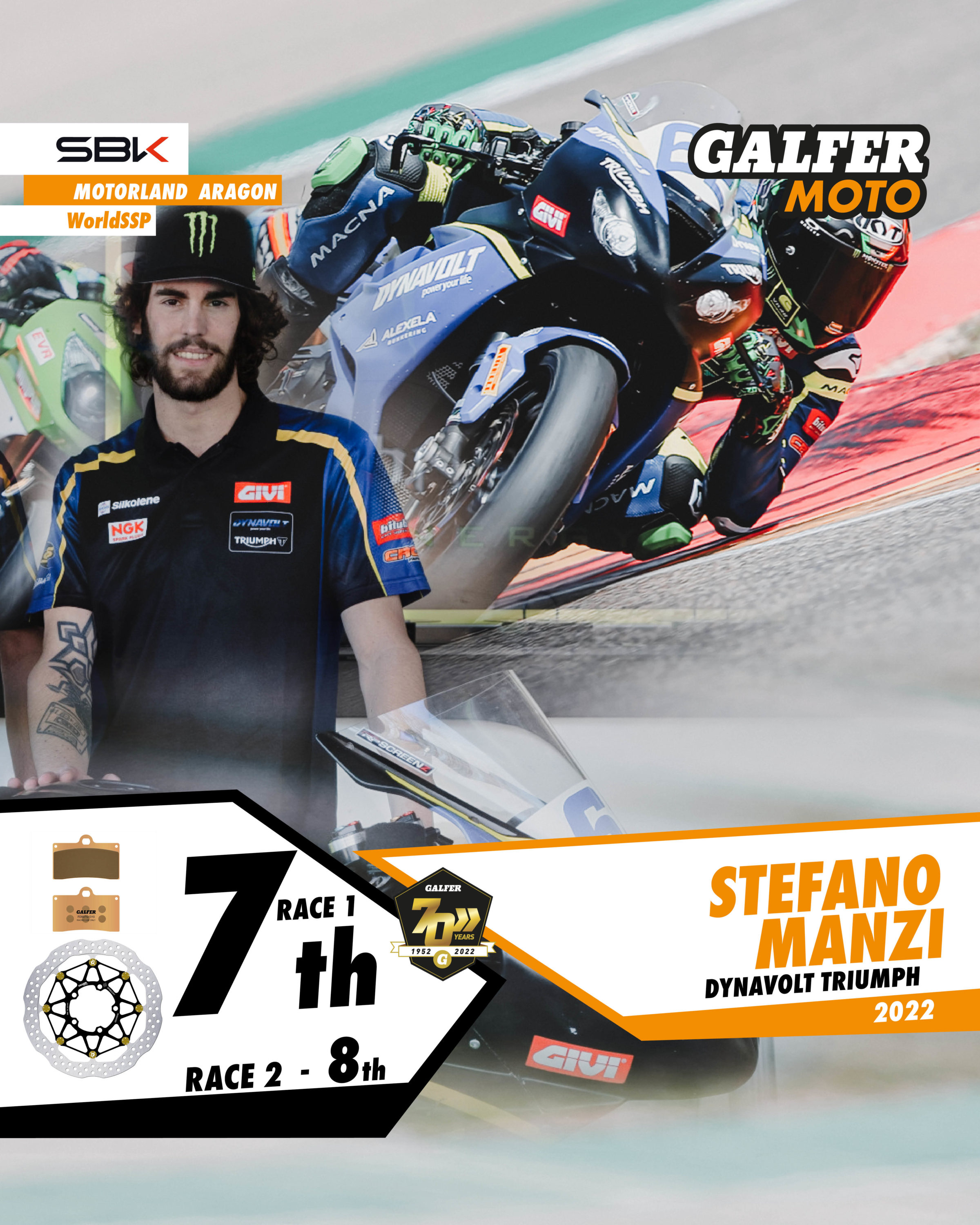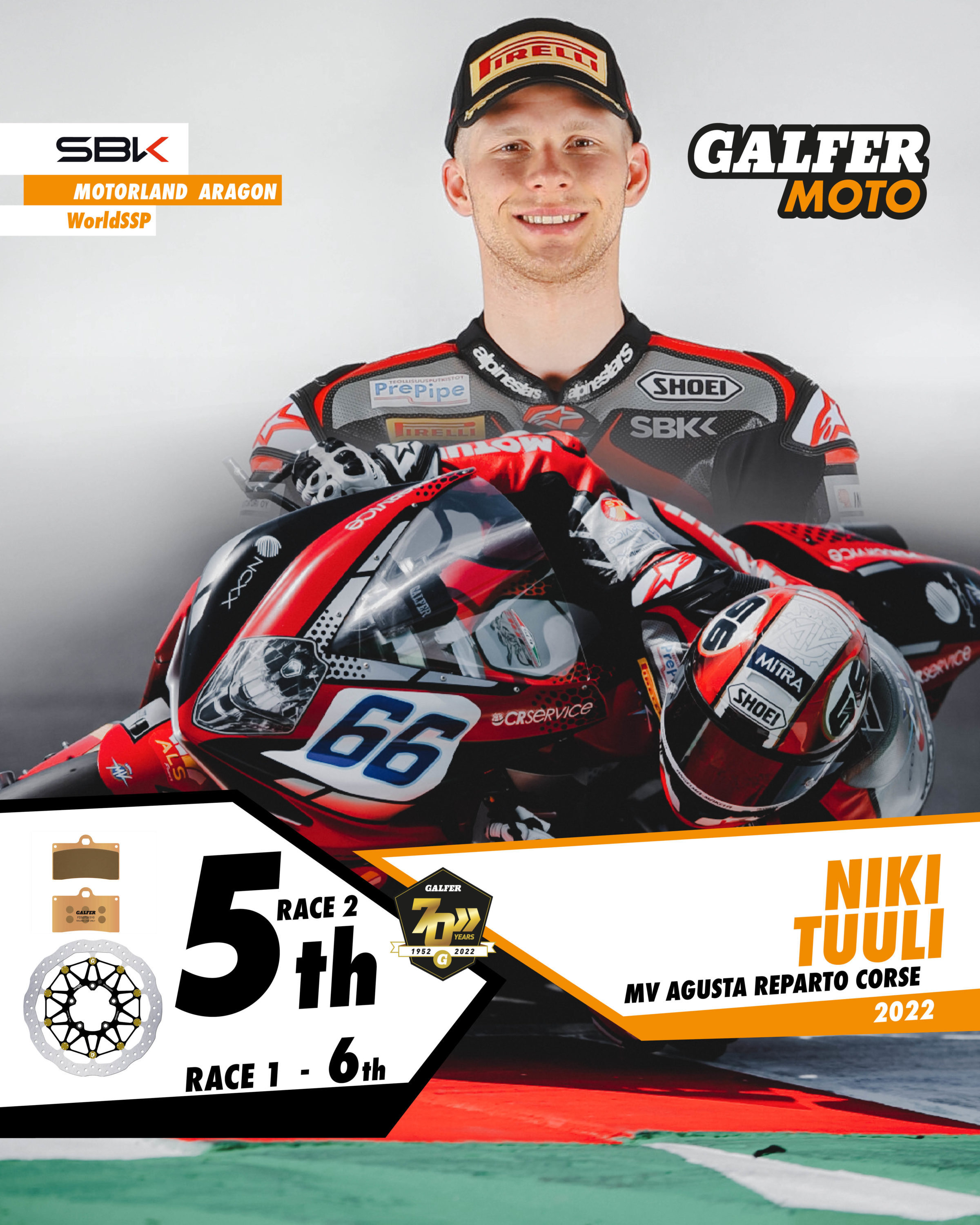 Of the other Galfer representatives, the performances of Finnish rider Niki Tulli (MV Agusta) and Italian rider Stefano Manzi (Dynavolt Triumph) deserve a mention. Both achieved a double top ten in Aragon: 5th and 6th for Tulli and 7th and 8th for Manzi.