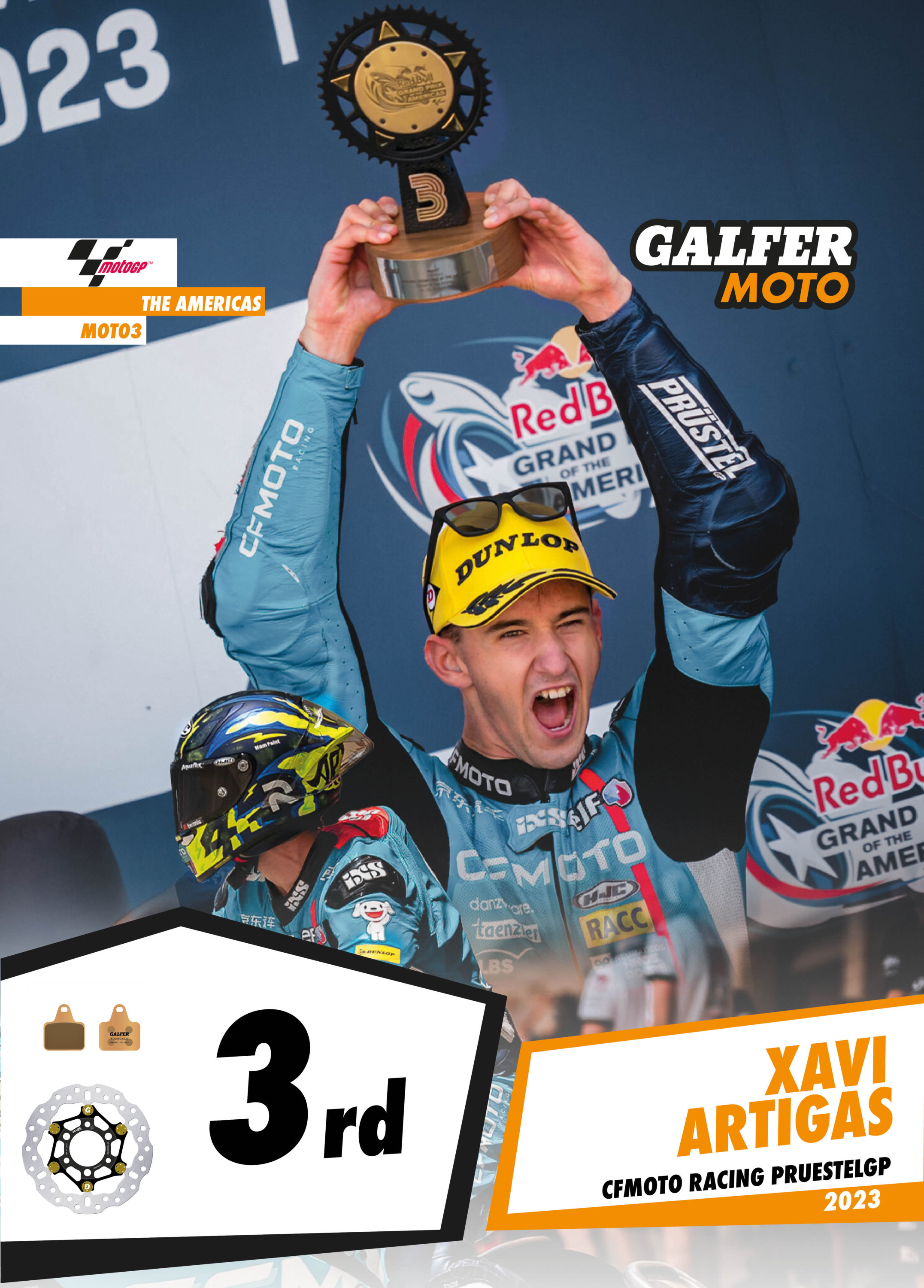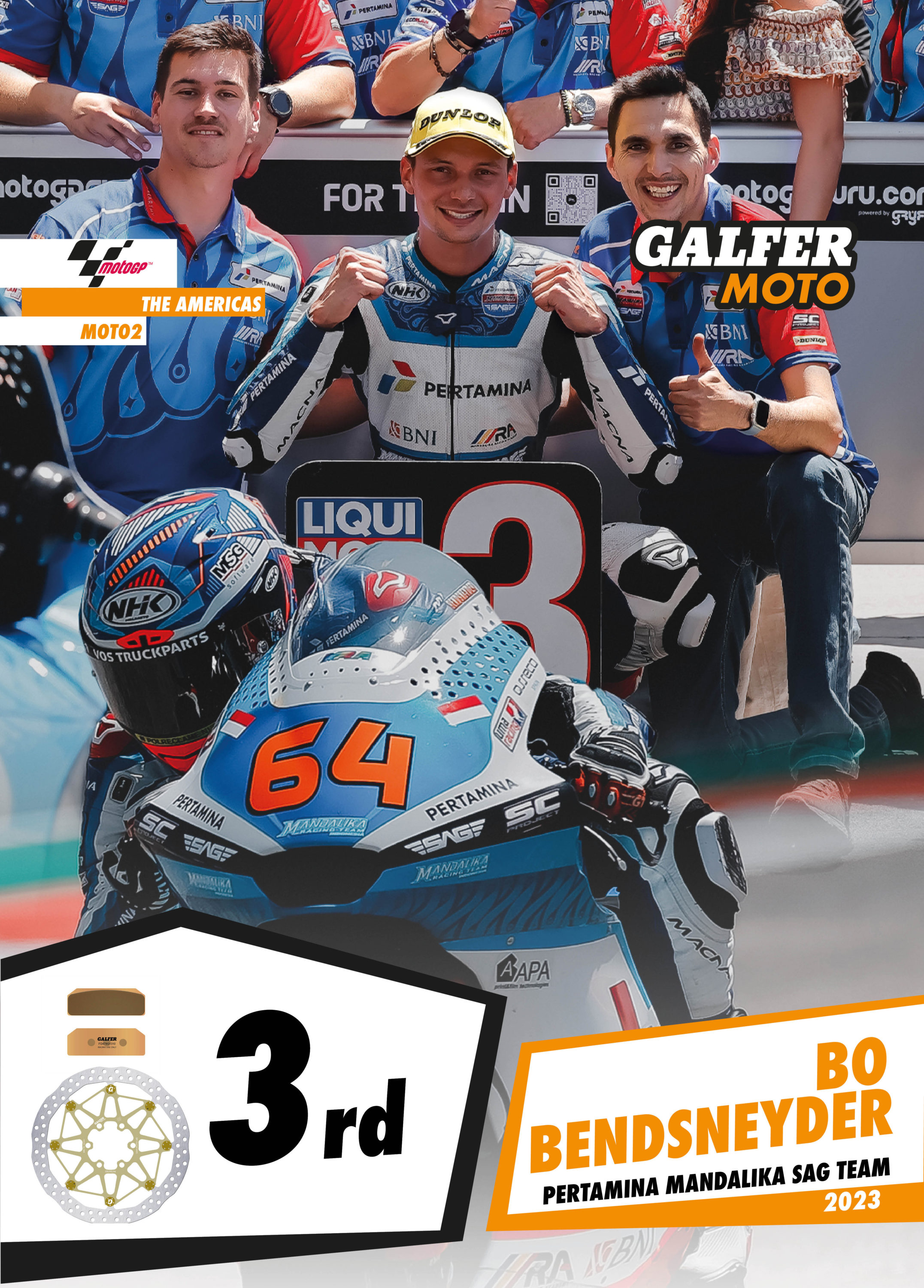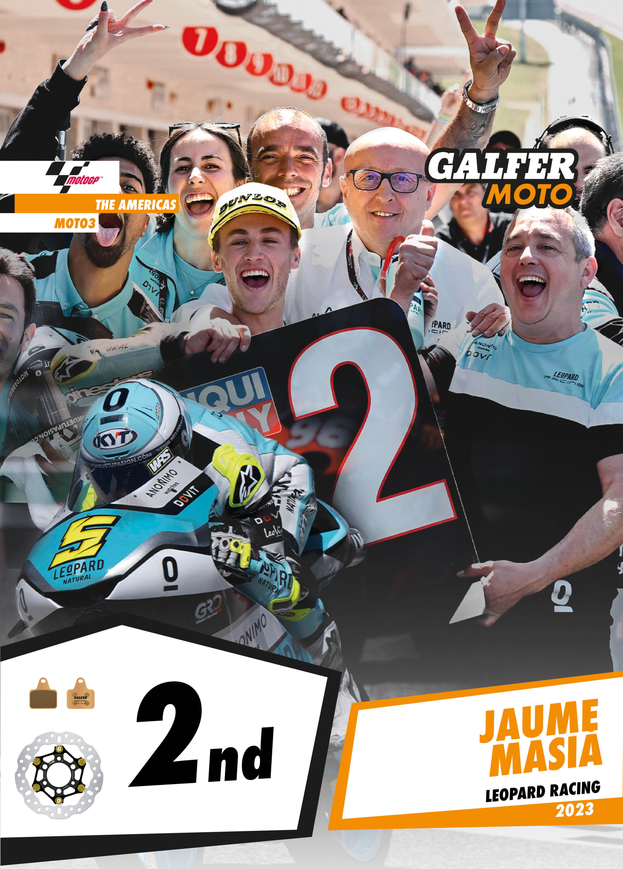 Bo Bendsneyder was outstanding in the Moto2 class, showing his full potential throughout the weekend. The Dutch rider’s times were close to the top ten in free practice and in qualifying he managed to make the second row of the starting grid with an excellent 4th place. A poor start to the race relegated Bo to 14th place, but from there he managed to move up lap after lap to reach the second group. In a breathtaking last lap, Bendsneyder overtook all of the other riders in the group to finish in third place, his first podium in the MotoGP2 World Championship. Bendsneyder’s Moto2 bike is equipped with Galfer Floatech® brake discs, which undoubtedly helped him achieve this fantastic comeback.