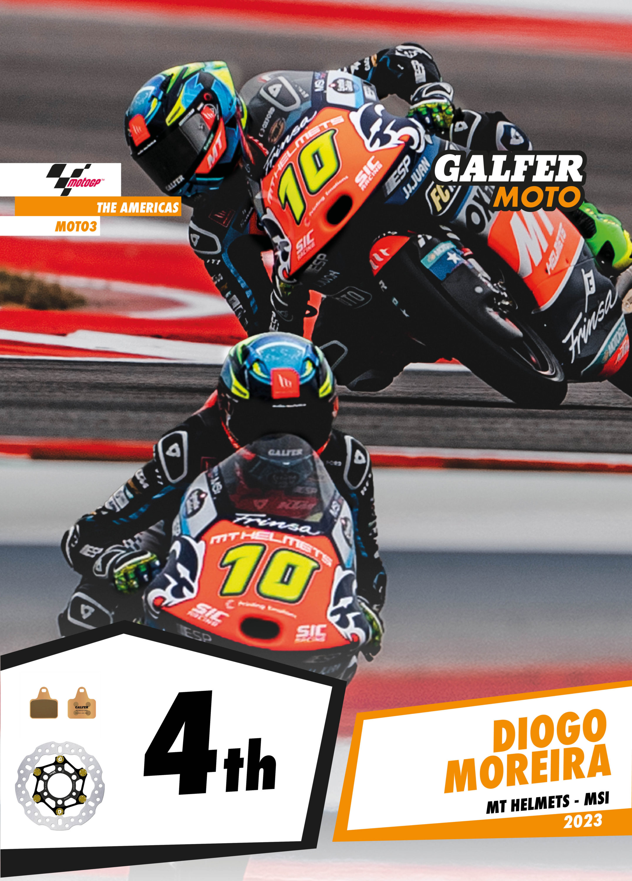 There was another close race In the Moto3 class, with several Galfer riders fighting for victory. In the end, Spanish riders Jaume Masià (Leopard Racing) and Xavi Artigas (PrüstelGP), both using Galfer brake components on their bikes, managed to take the second and third steps of the podium respectively. The fourth place went to Brazilian rider Diogo Moreira (MT Helmets-MSI), who is now provisional co-leader of the Moto3 general standings, tied on 49 points with Daniel Holgado.