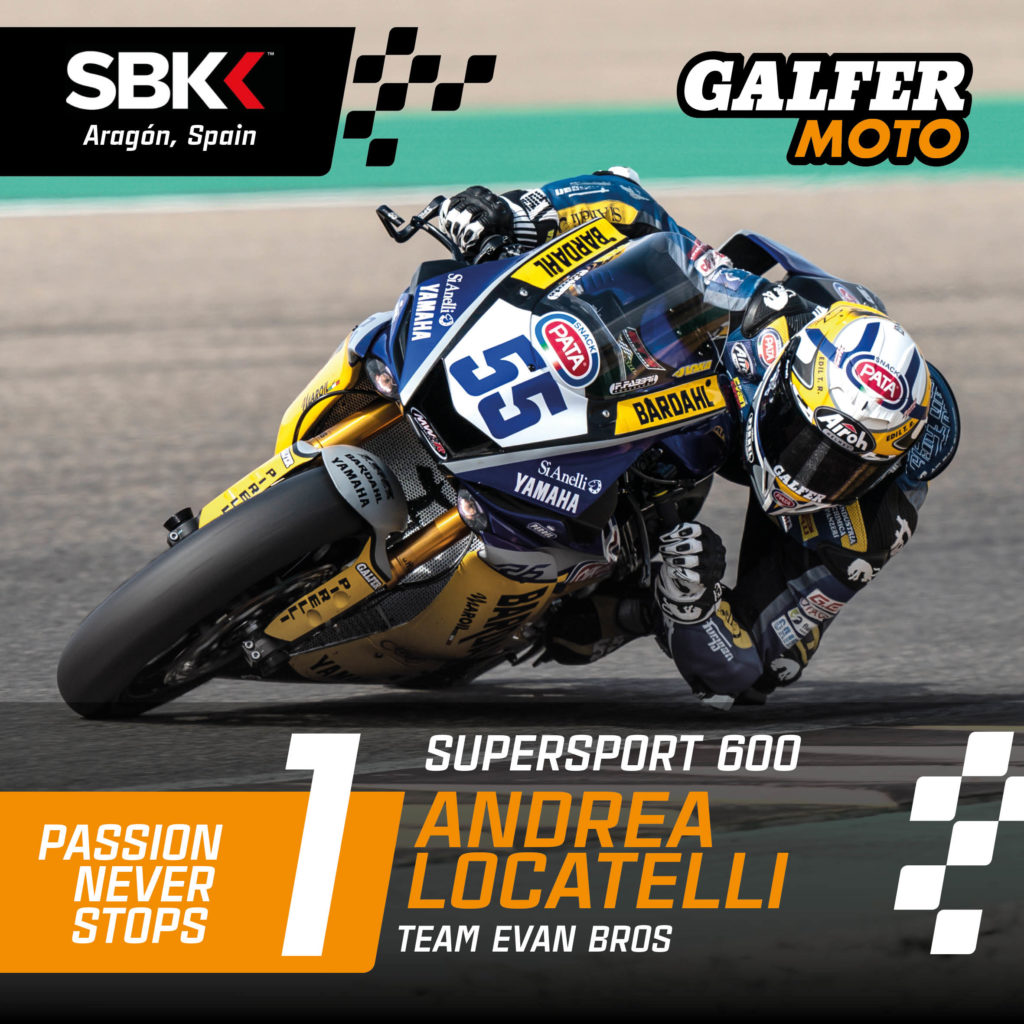 At the Motorland Aragón track, Italian rider Andrea Locatelli, of the Evan Bros team, claimed her 6th and 7th victory of the season of 7 races that have taken place up to now, achieving the record for consecutive wins in the Supersport 600 category.