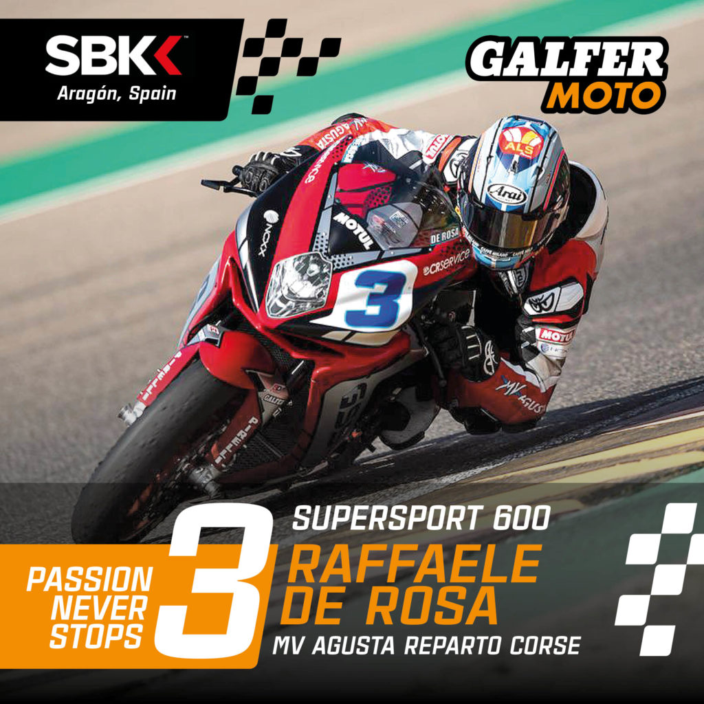 In the race held at Motorland Aragón (Spain), Locatelli won both races displaying undeniable dominance over her rivals. This significantly increases her lead in the general classification of the Supersport 600 World Championship. Andrea now has a total of 175 points, the maximum possible, and is 45 points ahead of her closest rival. In the same category, another GALFER rider, Raffaele de Rosa (MV Agusta), snatched a podium spot at Motorland, finishing 3rd in the second race.