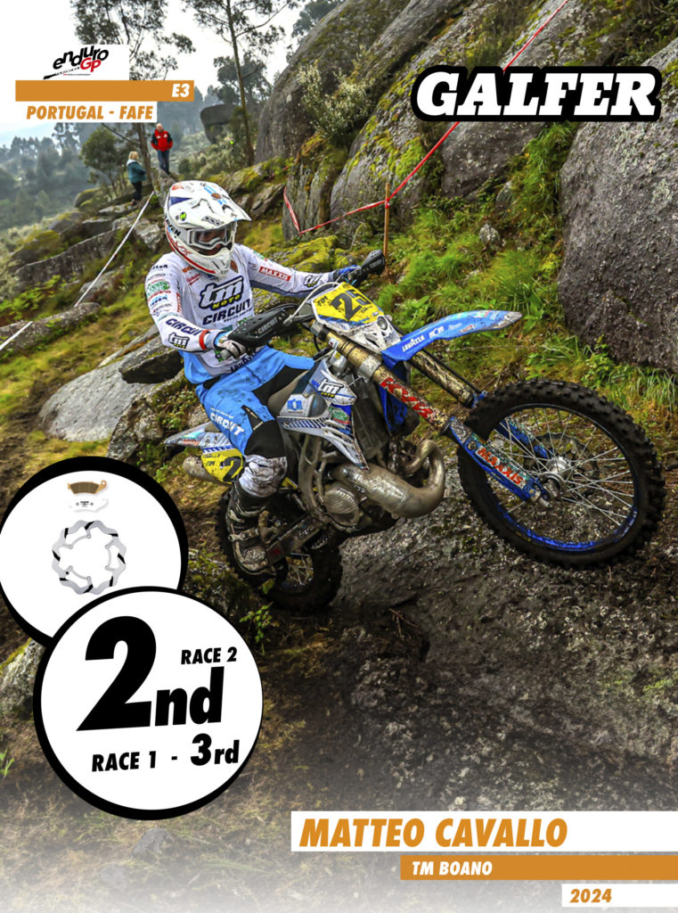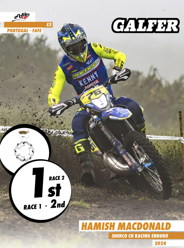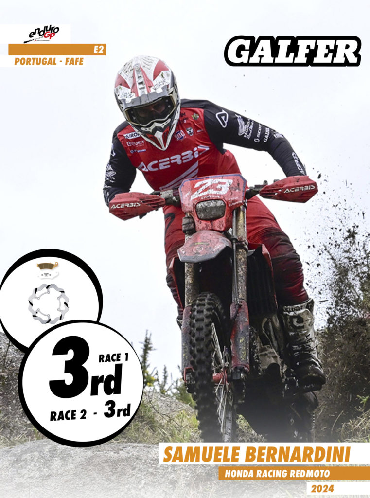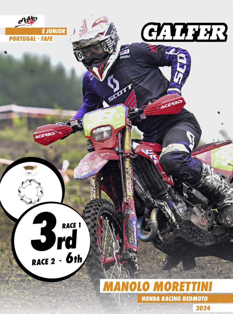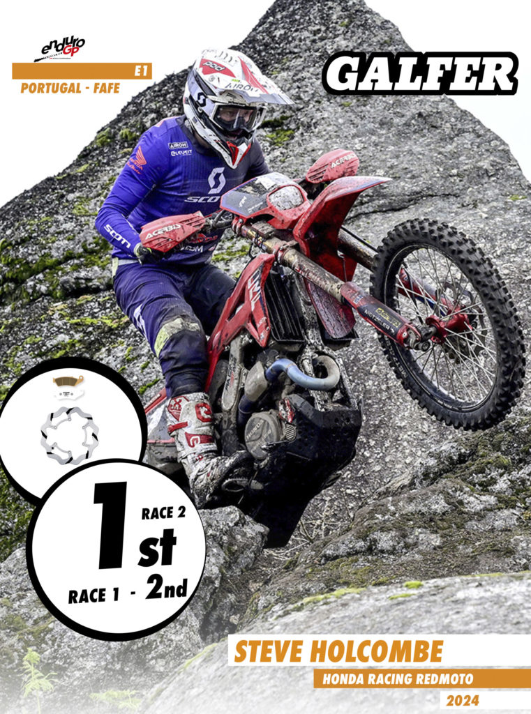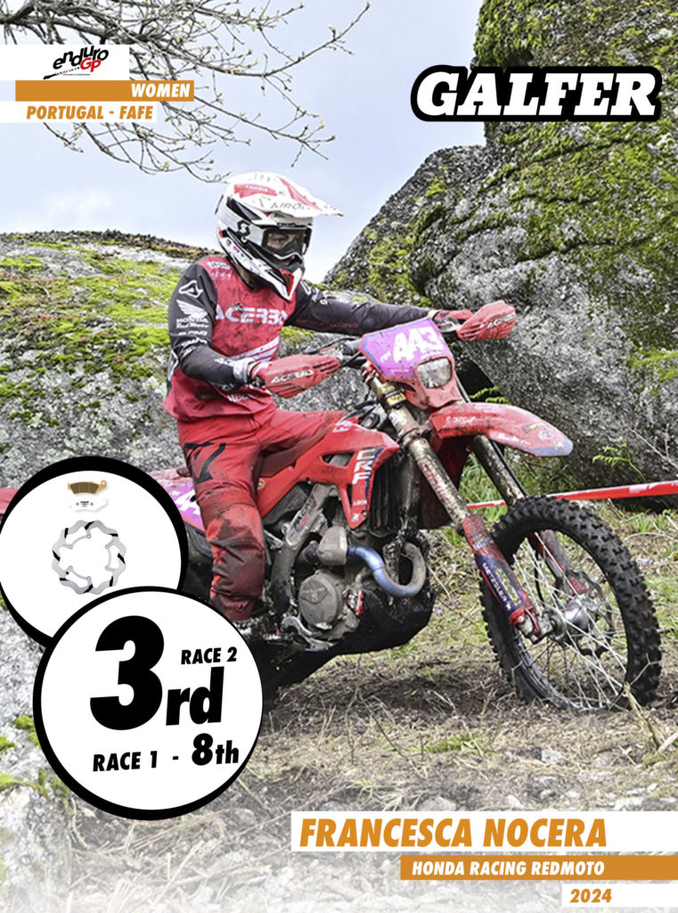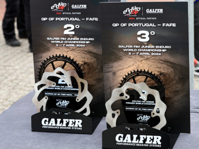 On the first day, participants in the Portuguese GP faced a challenging start with fog and slippery stones. However, this was no excuse not to give their best, showcasing their talent and effort in preseason training. Steve Holcombe, this year with the colors of Honda Racing RedMoto in the E1 category, secured a double podium with a victory in the second heat, securing second place in the overall Enduro GP standings. Once again, trusting in Galfer for his brakes, he equipped the grooved fixed disc along with Racing pads at the front and the rear wheel, the definitive Shark® disc model developed during the previous season with which he won the world championship title, also combined with Galfer’s Racing pads. His teammate, Samuele Bernardini, had a more than remarkable performance, finishing third in both heats and fifth in the overall Enduro GP standings. Manolo Morettini, a Honda rider in the Junior category, finished third in the first heat and sixth in the second. In the women’s category, Honda Racing RedMoto’s Francesca Nocera, although she didn’t have her best day in the first heat finishing eighth, showed all her potential in the second, managing to climb to the podium in third place.