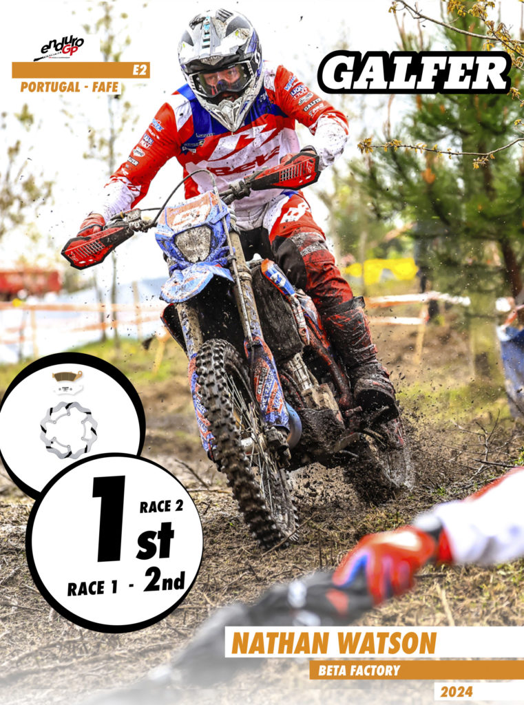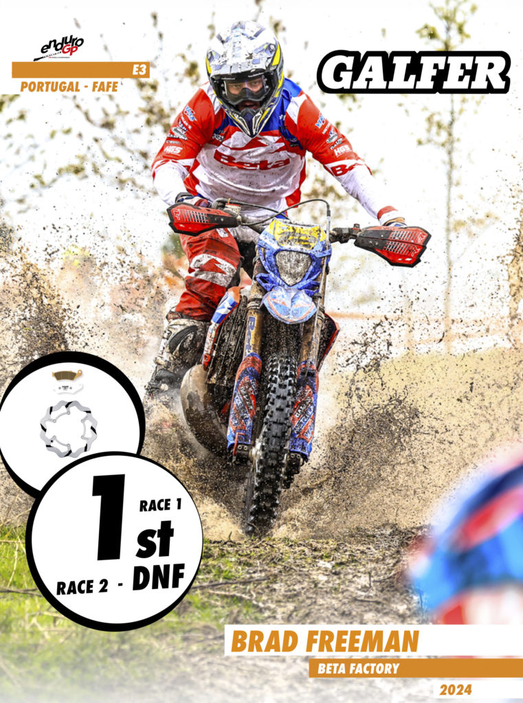 The EnduroGP season kicked off with the first of two consecutive GPs in Portugal. The FIM EnduroGP World Championship started last weekend in the city of Fafe with an outstanding performance from all Galfer riders, especially Steve Holcombe, Nathan Watson, Mireia Badia, and Brad Freeman, who claimed the top spot on the podium.
