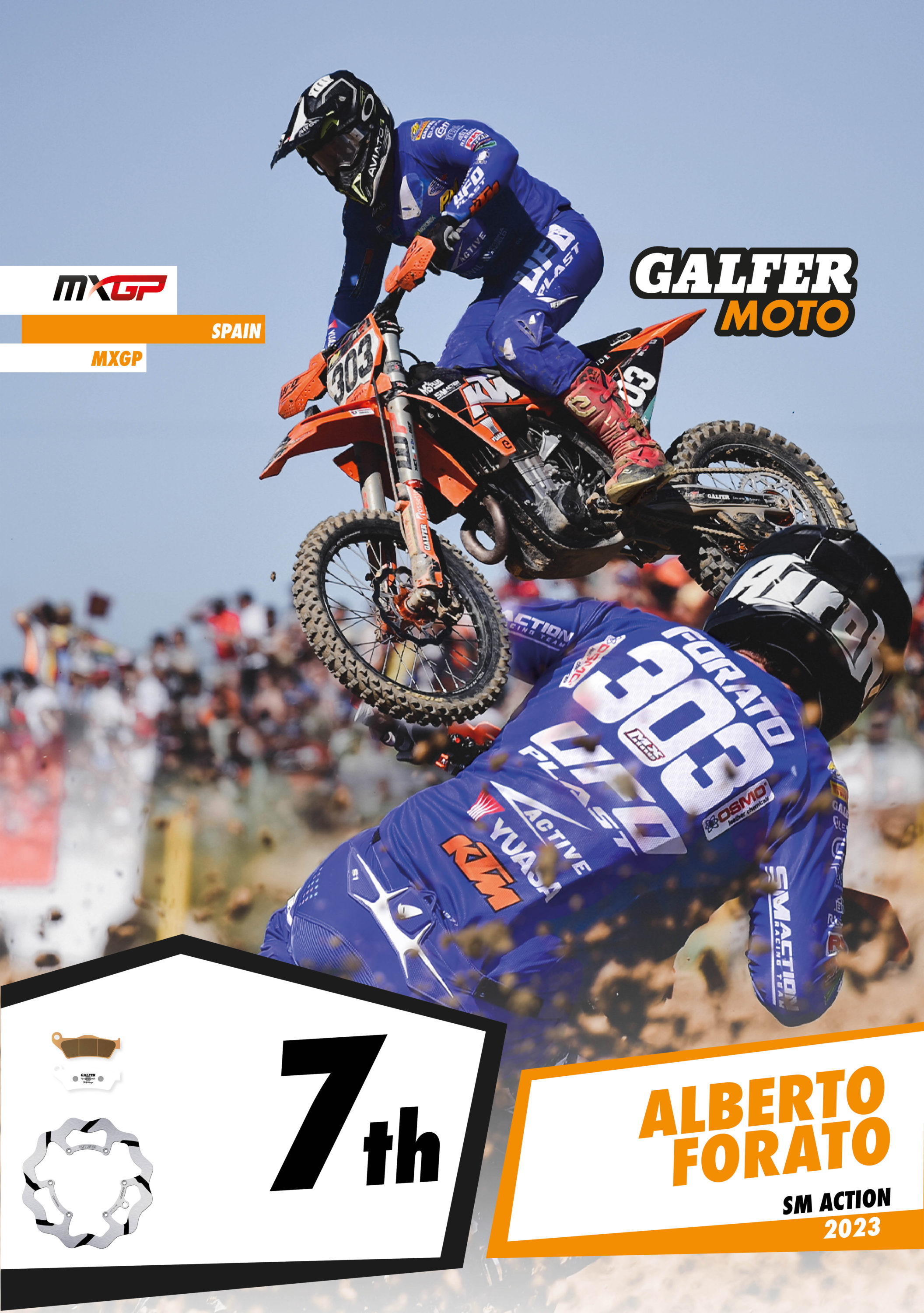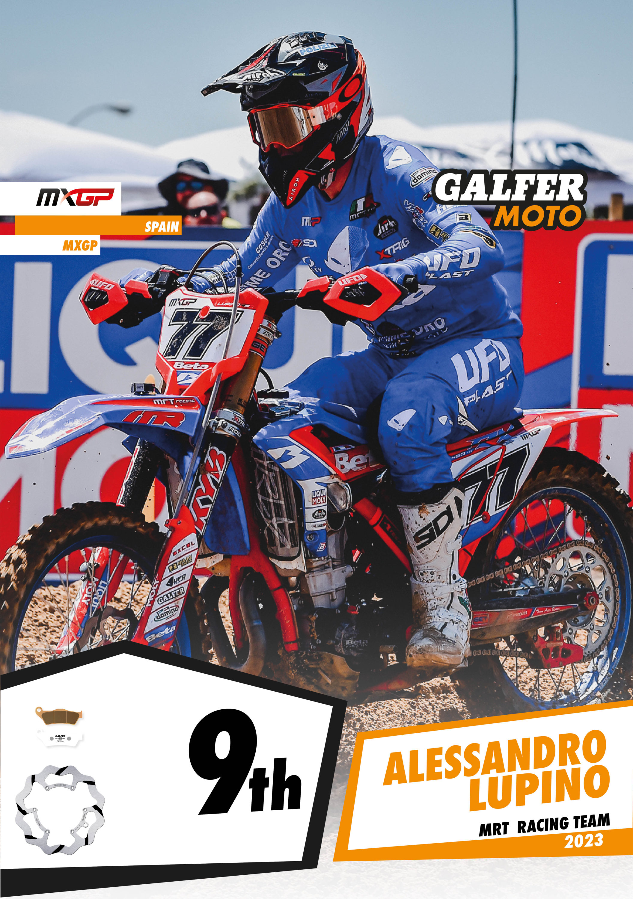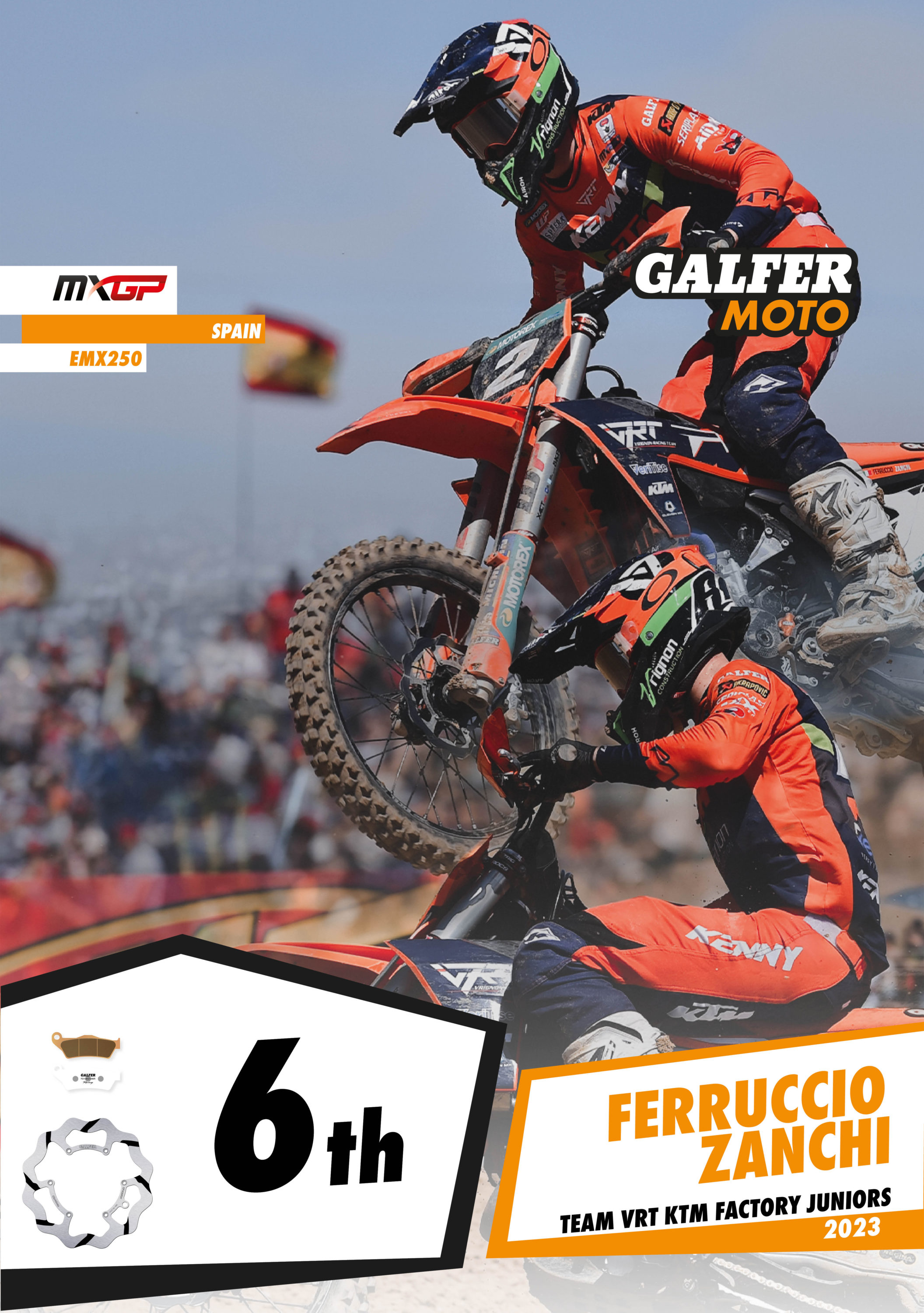 The MXGP of Spain took place this weekend, together with the WMX and EMX250 events, giving Galfer riders the chance to showcase their biking skills. Alberto Forato, the SM Action KTM rider, finished the weekend in a solid 7th position in the premier class, while Alessandro Lupino from MRT Racing Team BETA, after several weeks with health problems, demonstrated his talent without being intimidated by his rivals, to finish in 9th position. Both riders use Galfer DF606RWS oversize fixed grooved discs, together with Racing G1396R sintered pads that provide improved braking performance compared to their rivals.