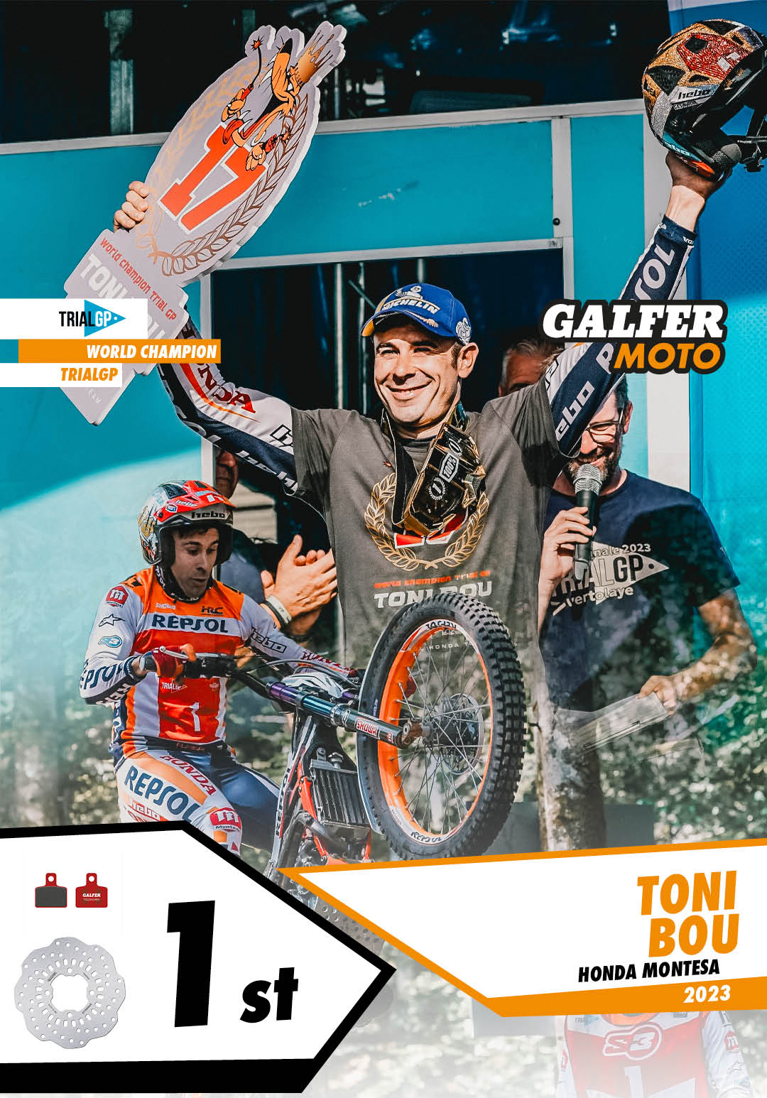 The talented Galfer rider, Toni Bou, representing Repsol Honda, achieved an impressive double victory in France, amassing a total of 271 points and securing 10 wins in the seven rounds contested throughout the season. These accomplishments allowed him to renew his TrialGP World Championship title in 2023. With an astonishing record of 17 outdoor titles since his debut with the Repsol Honda team in 2007, Toni Bou continues to expand his impressive list of achievements, totaling 33 titles in his career, spanning both X-Trial and TrialGP. In this season, the Montesa Cota 4RT, equipped with Galfer’s “Disc Wave®” fixed rotors and Trial Top G1805 brake pads, demonstrated its superiority over its competitors.