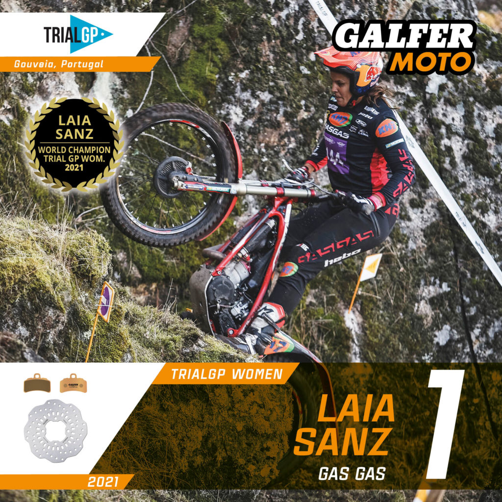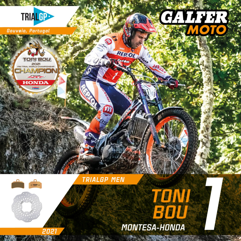 GALFER Trial riders, both male and female, were unbeatable again in the 2021 season. In the men’s category, Toni Bou (Montesa-Honda) won his 15th outdoor Trial World Championship after taking victory in the final race in Portugal, despite only needing one point to win the championship. Toni Bou had four penalty points fewer than Adam Raga (TRRS) and six fewer than Jaime Busto (Vertigo) and therefore topped the podium with his Montesa-Honda equipped with GALFER disc brakes and pads. The event was also marked by the retirement of his Japanese team-mate, Takahisa Fujinami, who bids farewell to racing after 26 seasons and one world title in 2004.