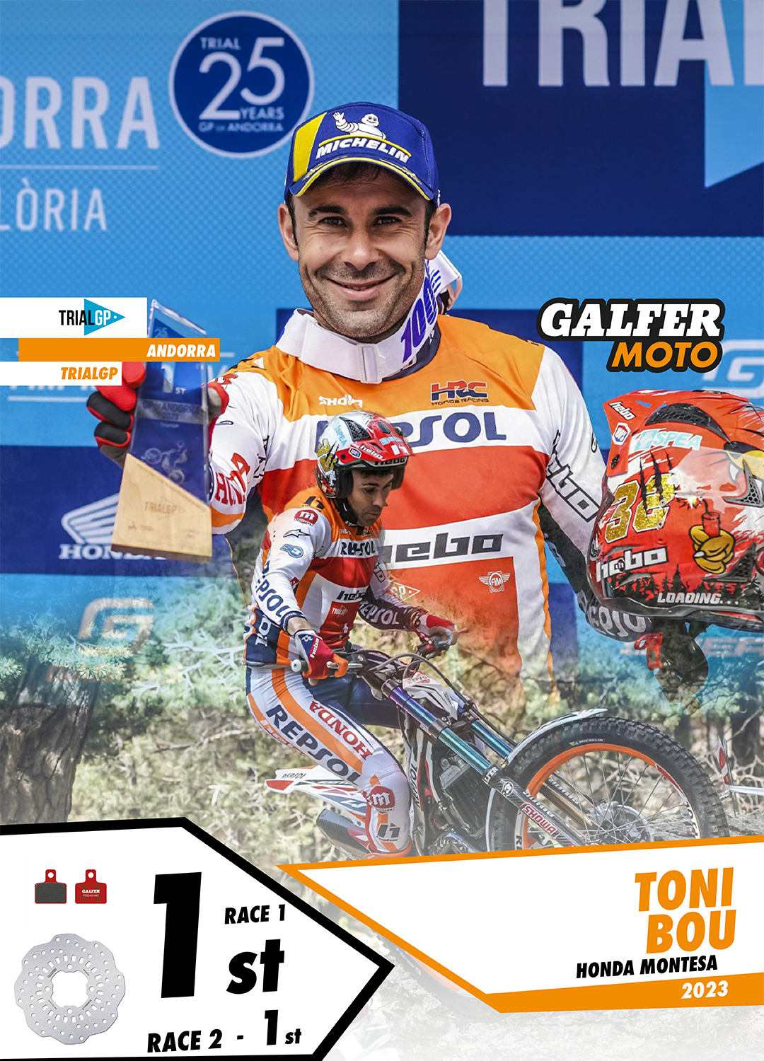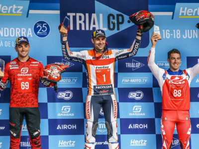 After the weekend in the village of Sant Julià de Lòria, in the Principality of Andorra, the fifth round of outdoor trial took place, with intense rain being the main protagonist, resulting in a lot of mud and slippery sections, posing a great challenge for the Galfer riders. Toni Bou, from the Repsol Honda Trial Team, claimed a double victory, demonstrating superiority in almost all sections. It was a perfect weekend, as he himself stated.