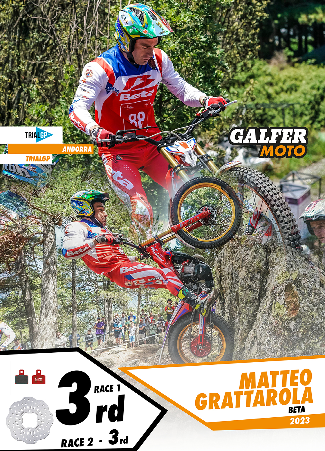 In this way, the Galfer riders achieved a triple success in the premier category of the Trial world, all of them using the “Disc Wave®” fixed brake discs (W at the front and WLLG at the rear), along with the semi-metallic Trial Top G1805 or sintered G1395 brake pads depending on the terrain conditions.
