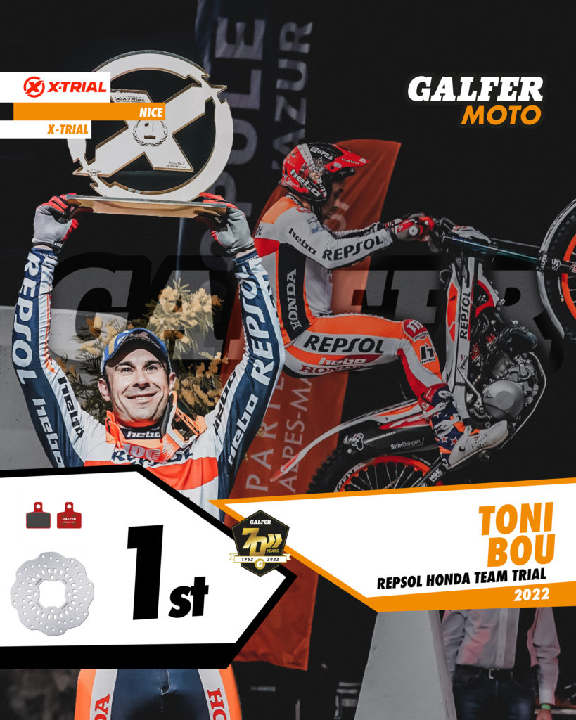 Toni Bou dominated the qualifying rounds comfortably, being the best rider among all the participants. In the final, Bou put in an excellent performance in which he was only penalised with 2 points, compared with 13 for the runner-up. A result that was more than enough for him to take the victory in Nice, ahead of his rivals Adam Raga and Galfer rider Matteo Grattarola (Beta). In 4th and 5th place were Jaime Busto (Vertigo) and Benoit Bincaz (Gas Gas), respectively, both also Galfer riders.