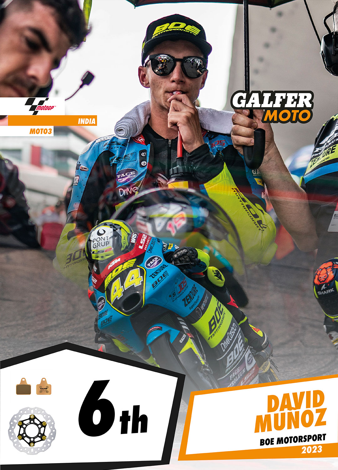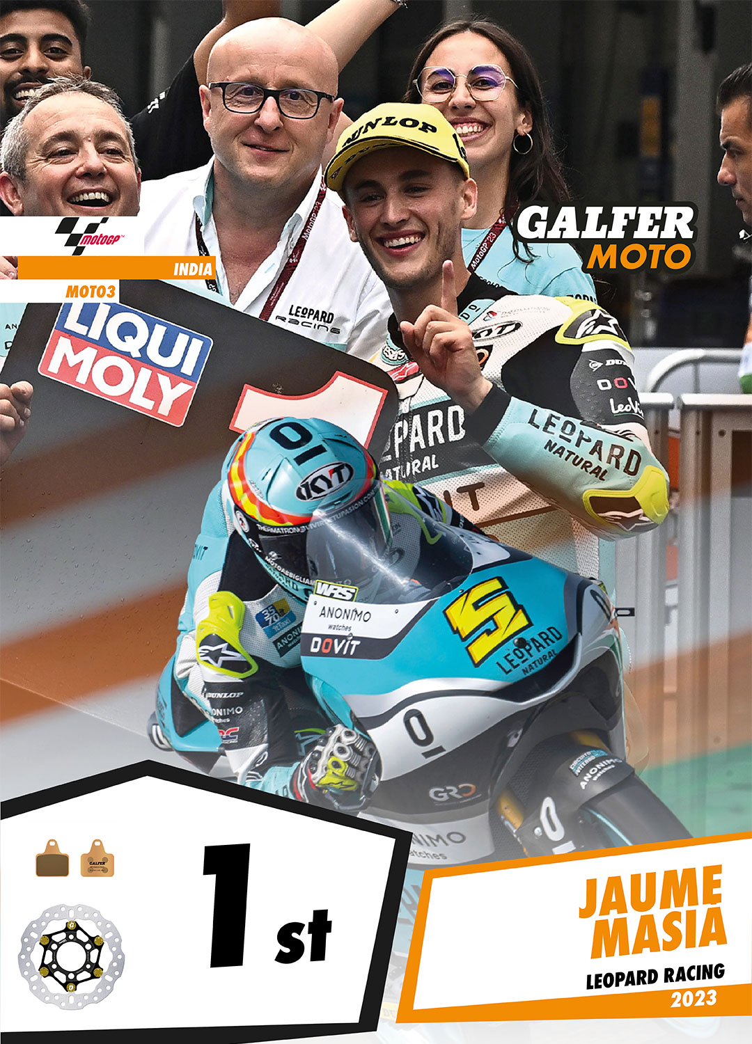 Jaume Masià has secured a clear victory in Moto3, his second of the 2023 season, at the new Buddh Circuit in India, a track demanding on the brakes. Masià, who already clinched the “pole position” on Saturday, led the Moto3 race throughout, demonstrating great riding skills and avoiding mistakes to secure the victory with a lead of over 5 seconds over his closest pursuer. Consequently, Jaume Masià is now tied for the championship lead with 174 points, with 7 races left to go and an upward trend. It’s also worth noting the strong performance of another Galfer representative, David Muñoz (Boé Motorsport), who finished in a commendable 6th position. On the other hand, Xavi Artigas (PruestelGP) earned valuable points with a 12th-place finish, while Diogo Moreira (MT Helmets – MSI) could only manage 13th despite starting from the second row of the grid.