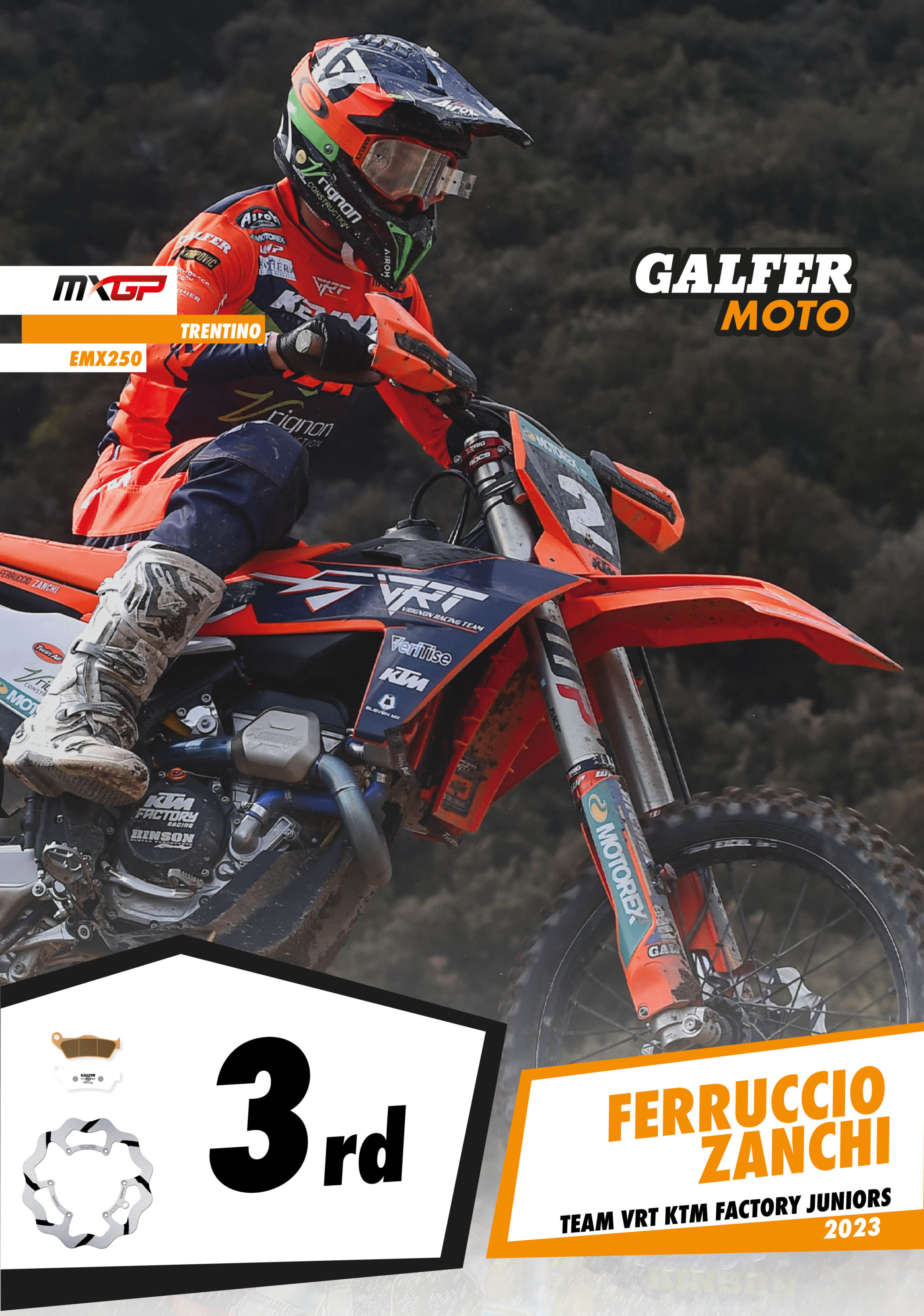 Valerio Lata (Beddini Racing KTM) performed magnificently in the EMX250 class, achieving one victory and one second place in the two rounds, which was enough to take victory in the GP of Trentino. Another Italian rider and Galfer representative, Ferruccio Zanchi (Team VRT KTM Factory Juniors), took his first podium of the season, finishing third, while his teammate, Frenchman Marc-Antoine Rossi, finished 5th. Valerio Lata is now in second place in the overall EMX250 classification, 22 points behind the leader.