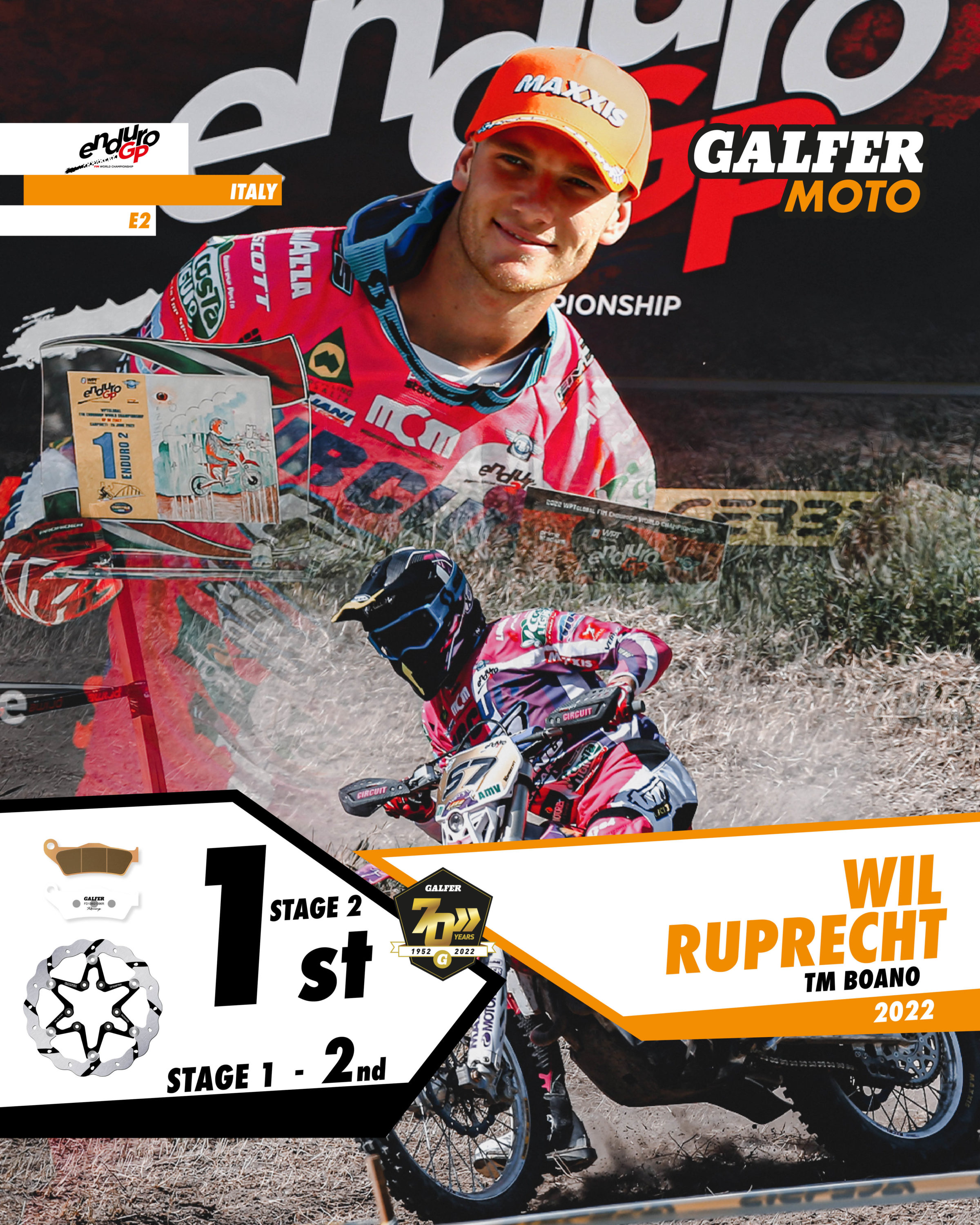 The third round of the Enduro World Championship was held in Carpineti (Italy), in extremely hot and dusty conditions, where Wil Ruprecht (#57) stood out from his rivals. The Australian rider set the second fastest time on Saturday and the fastest time on Sunday, giving him the overall victory in both the EnduroGP and E2 categories. Ruprecht and his TM Racing motorbike, equipped with Galfer brake products, now lead the overall GP championship by 6 points and the E2 category with an 11 point difference.