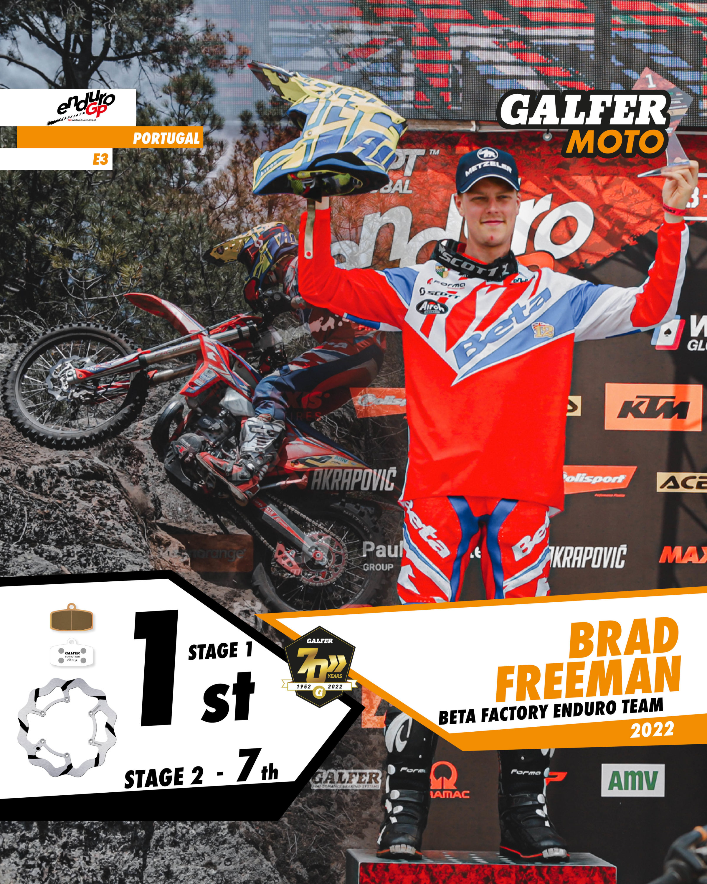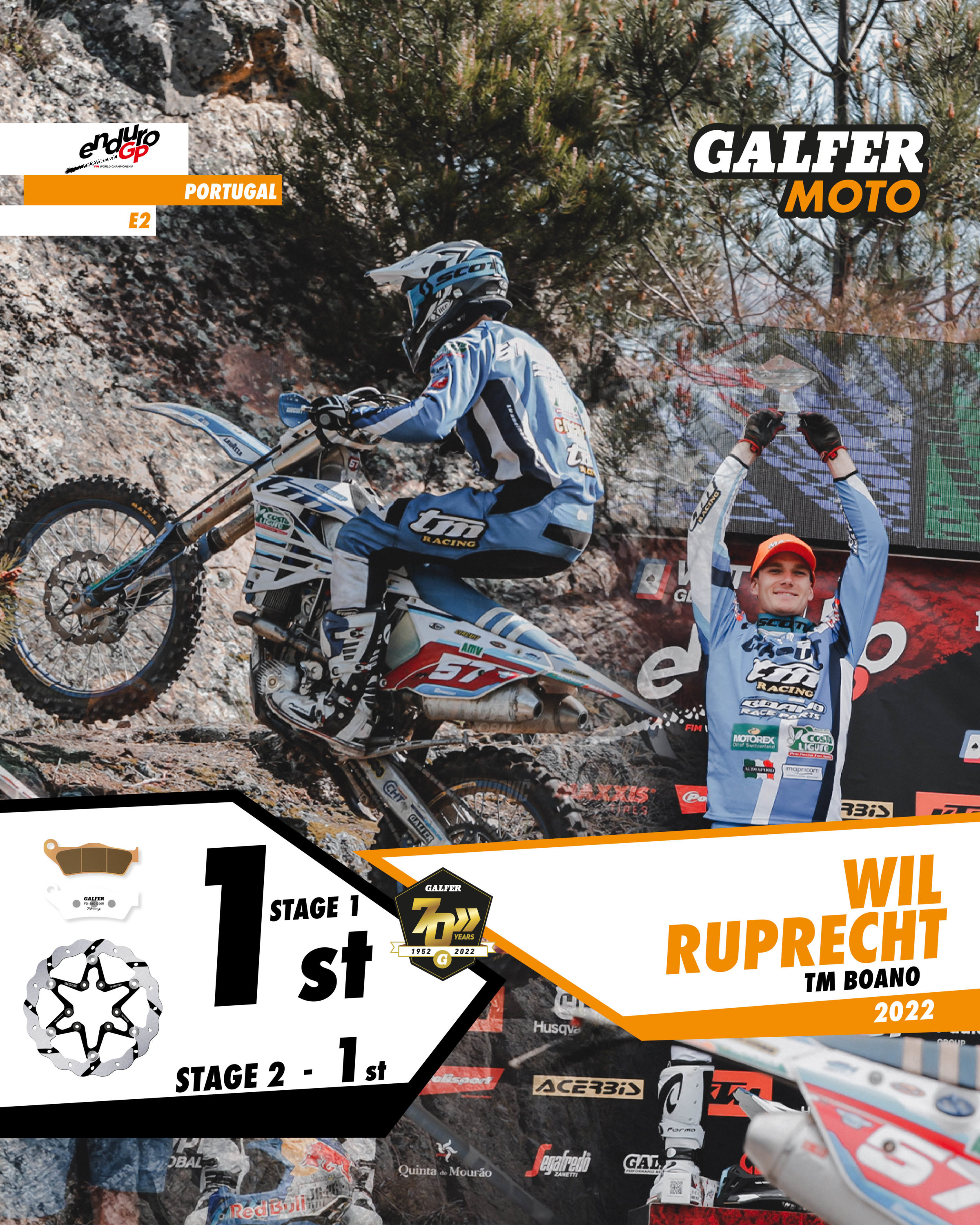 Wil Ruprecht (#57) dominated the EnduroGP of Portugal, where he won every possible victory, placing him as the provisional leader of the overall championship. Ruprecht set the fastest times in the special stages on his TM Racing motorbike equipped with “Disc Wave®” FRW floating brake discs and Racing G1396R sintered brake pads. Wil Ruprecht is now the overall leader in E2, with a 5-point lead, and overall leader in EnduroGP, with a 1-point lead over his nearest rivals with two of the seven races completed.